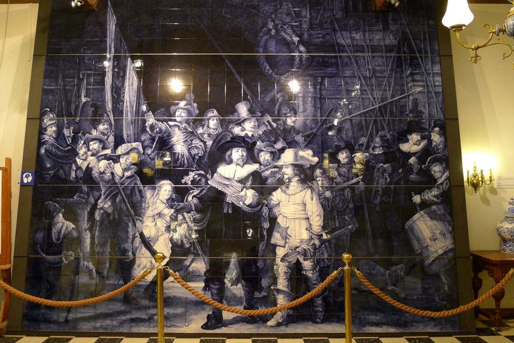 А это копия знаменитой картины Рембранта «Ночной дозор», занимающая целую стену зала. Два художника работали над картиной из 480 плиток размером 18х18 см больше года -с мая 1999 г. (год Рембрандта в Голландии) по июнь 2000 г. Картина оригинального «Ночного дозора» была спроецирована на составленные вместе белые плитки. Затем на плитки были нанесены контуры картины углем и карандашом, после чего двое художников расписывали составленные вместе плитки краской, причем один начал роспись с правой стороны, другой – с левой.
