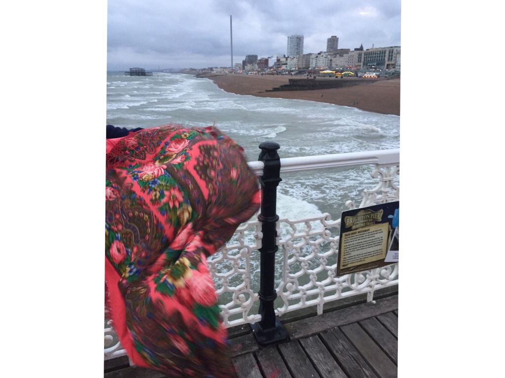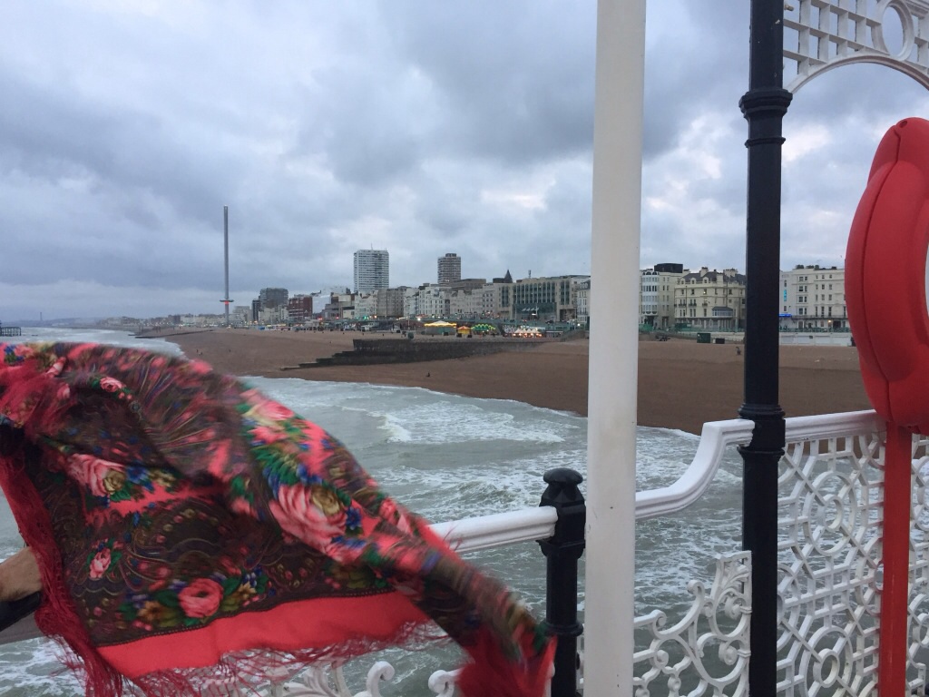 На знаменитом Брайтонском пирсе, игра с ветром поздно вечером.