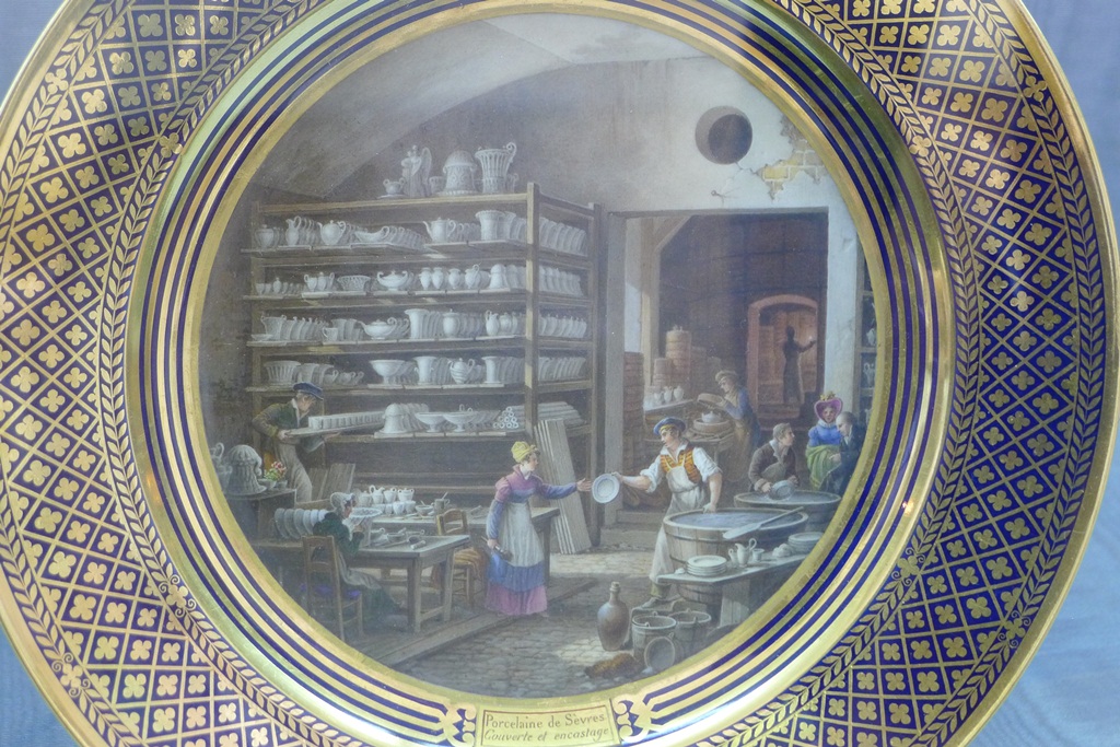 Ну и, само собой, увековечили в фарфоре родное предприятие. На тарелках - Севрская фарфоровая мануфактура, обжиг в муфельных печах, на 2-м фото - глазурование и еще какой-то процесс, перевести не удалось.