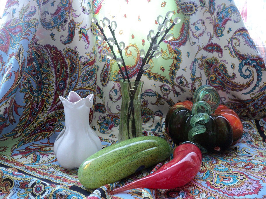 Еще одна композиция из любимых мною стеклянных овощей (есть в коллекции еще и фрукты). Тыква. чеснок и верба (мастерские Санкт-Петербургской государственной художественно-промышленной академии им. В. Мухиной/А. Штиглица) , огурец и перец (белорусское предприятие "Неман"). Подобные вещички когда-то показывала Каффа.