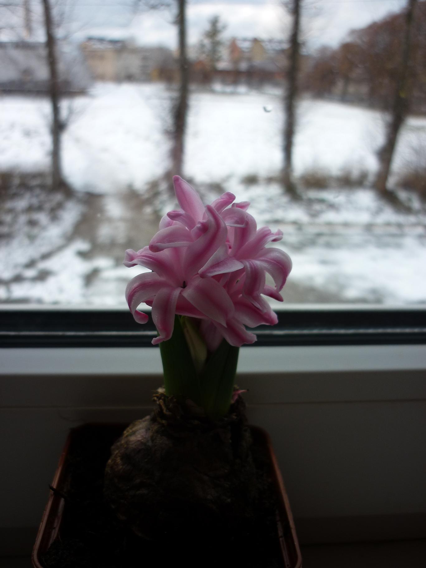 На работе подарили цветочную композицию по случаю праздников. Гиацинты сейчас распускаются по одному и дивно пахнут.