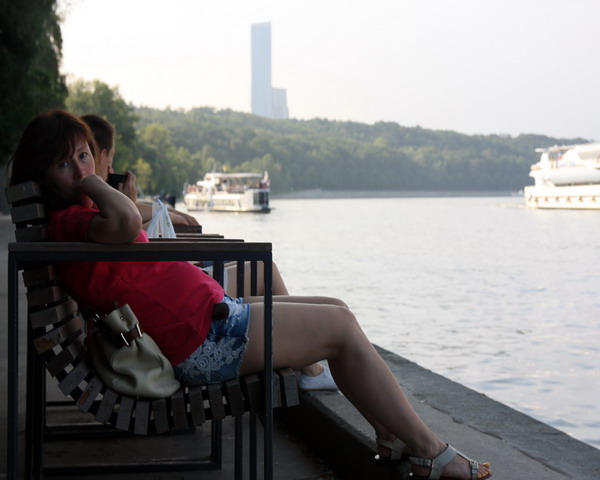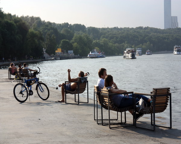 Народу на набережной много. На велосипедах, роликах, в шезлонгах. Настоящий летний отдых. Жаль, нет запаха морской воды.