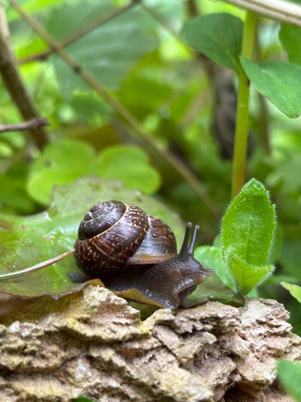 Улиточка как будто позирует. А цвета какие потрясающие, настоящий май - вся палитра зеленого и салатового, коричневый