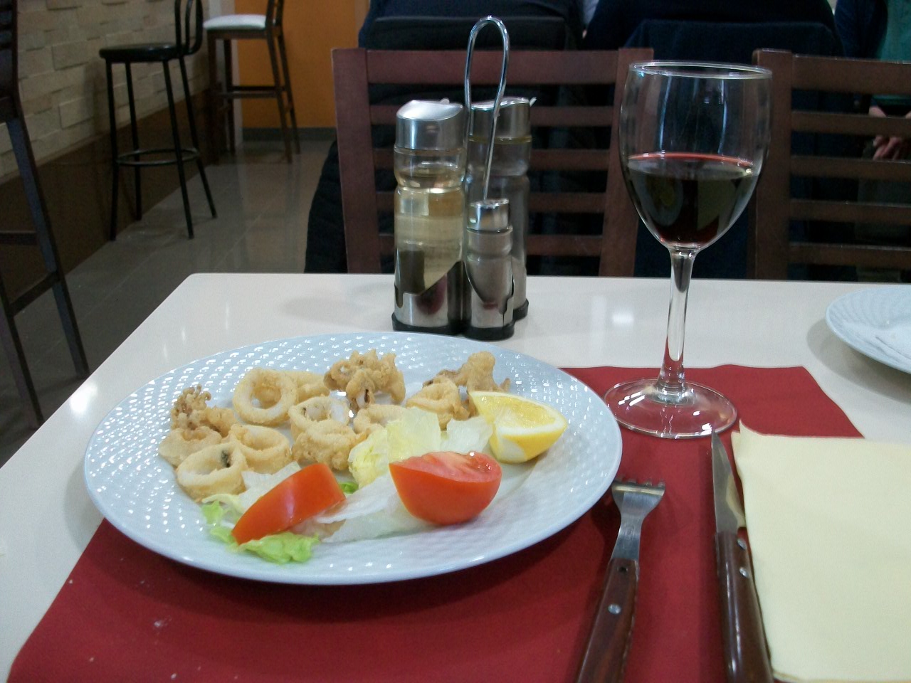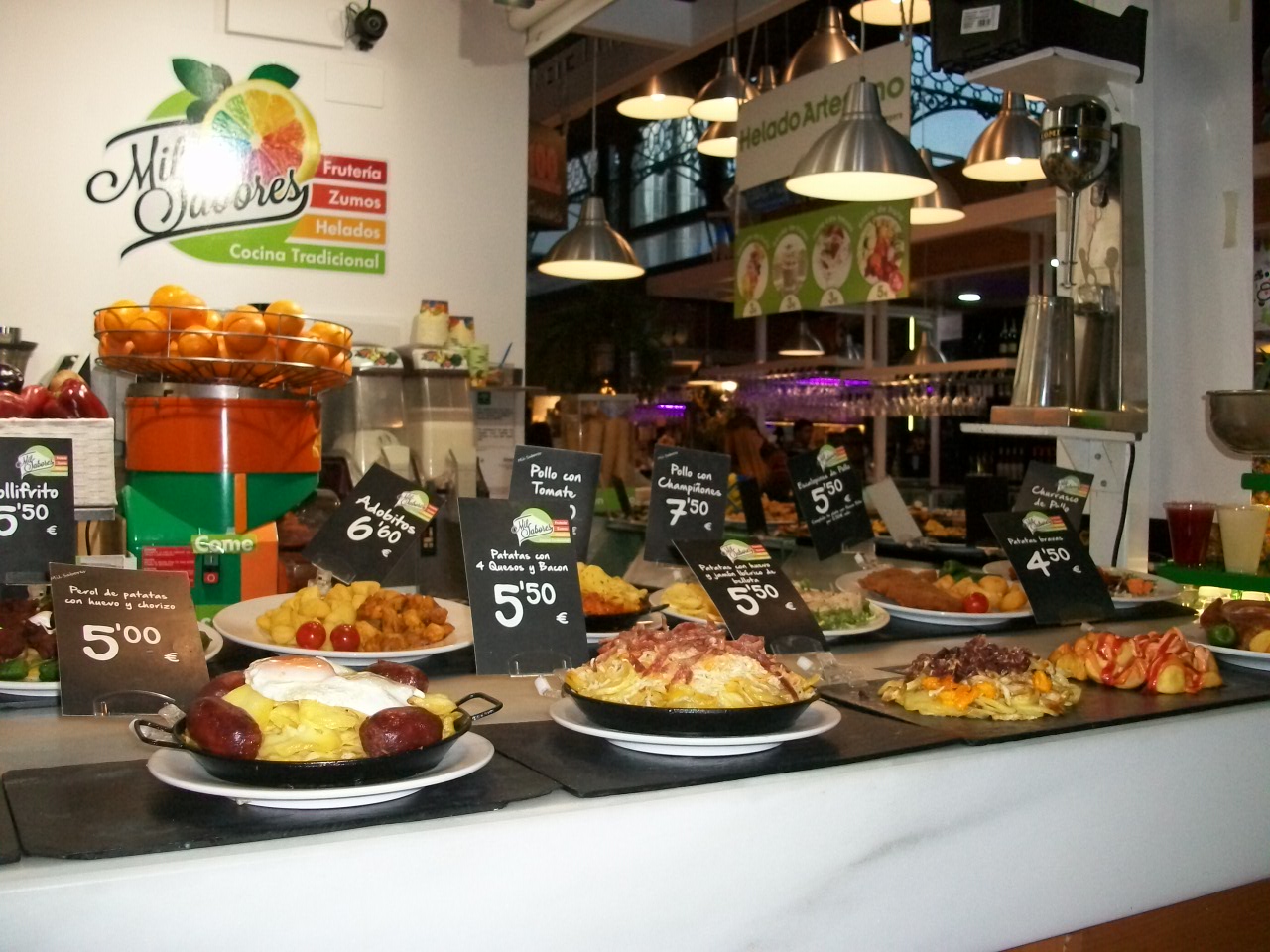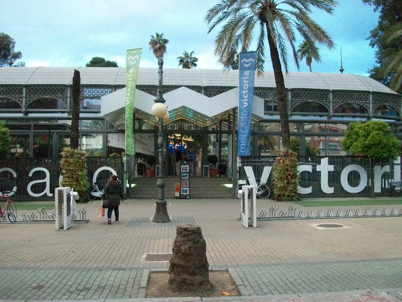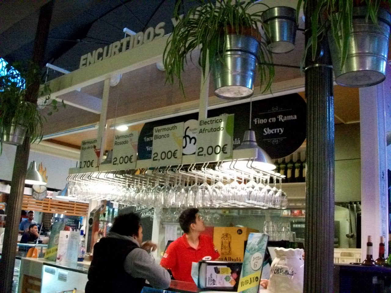 Если идти по бульвару от вокзала к историческому центру, то на середине дороги будет рынок. Он отличается от привычного мне рынка тем, чтио в нём продают не продукты для приготовления (овощи, мясо, крупы), а уже готовую еду и вино в разлив. Что удобно, особенно для тех кто не знает испанского языка (а меню не английском не везде есть, а меню с фотографиями блюд мне в Испании вообще не встречалось). Помню, как в свой первый приезд в Испанию (в Барселону) и делала выбор методом тыка. :lol:
