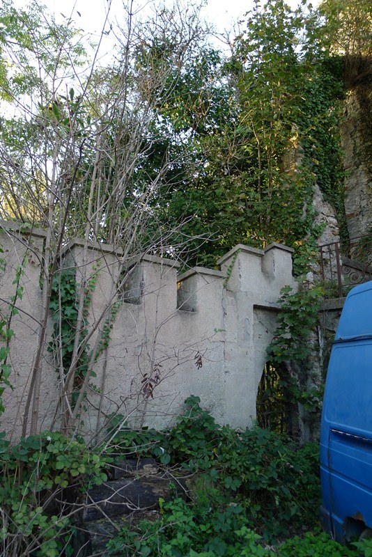 Возвращаемся, выходим из ворот, огибаем круглую привратную башню, идем снаружи вдоль стены. Башенки, и круглая, и квадратная, в неприглядном виде. Оконца выбиты либо заколочены, черепица крыш провалилась… Буйные заросли совсем поглотили и стену, и фронтон замка.