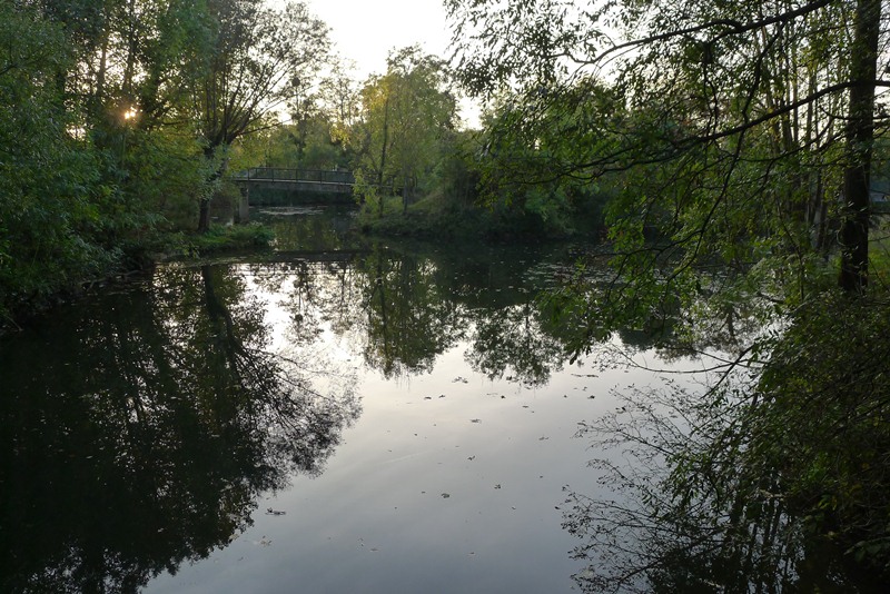 Подошли к очередному мостику. Уже совсем свечерело. Во все стороны открывались чарующие виды на речку Yerres (приток Сены). Добрели до пруда, миновали заросли пламенеющей калины. Вокруг темнел почти непроходимый лес.