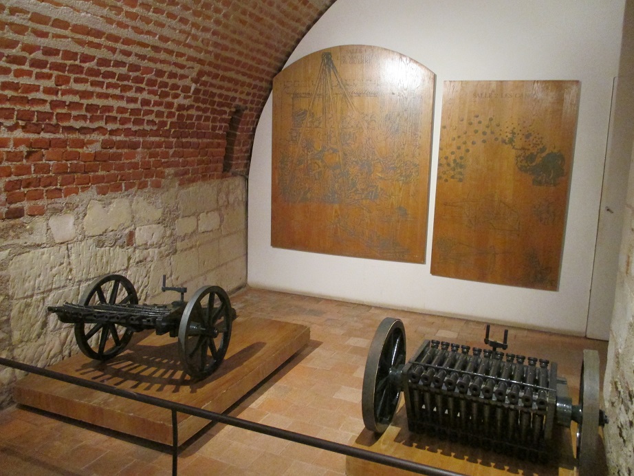 В нескольких залах полуподвального помещения выставлены макеты устройств, изобретённых Леонардо - куча всего из области военного искусства, гражданского строительства, машиностроения, оптики, гидравлики, аэродинамики...