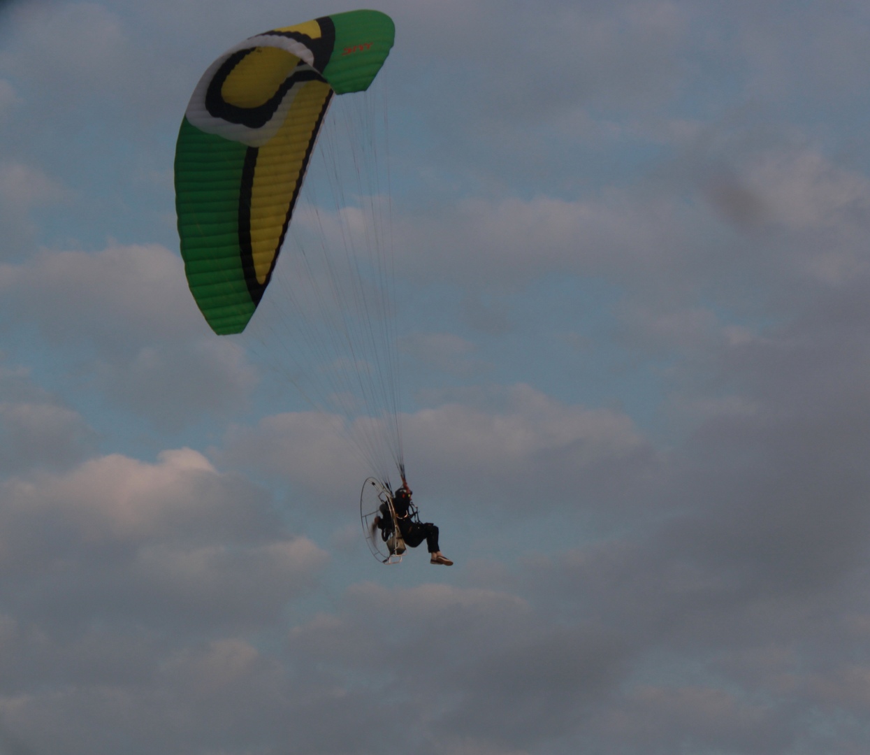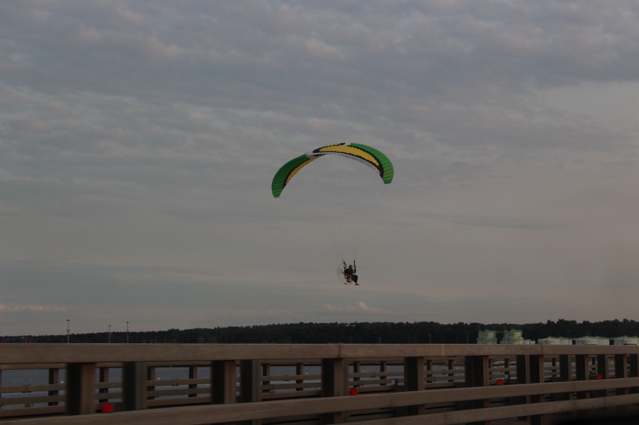 Дамба-то как красиво получилась... У Вас талант несомненный, всё как надо получается. Техника - суровая, небо и море = две равноправные стихии, парашютист (или как его) - немного сникшая, но птица!