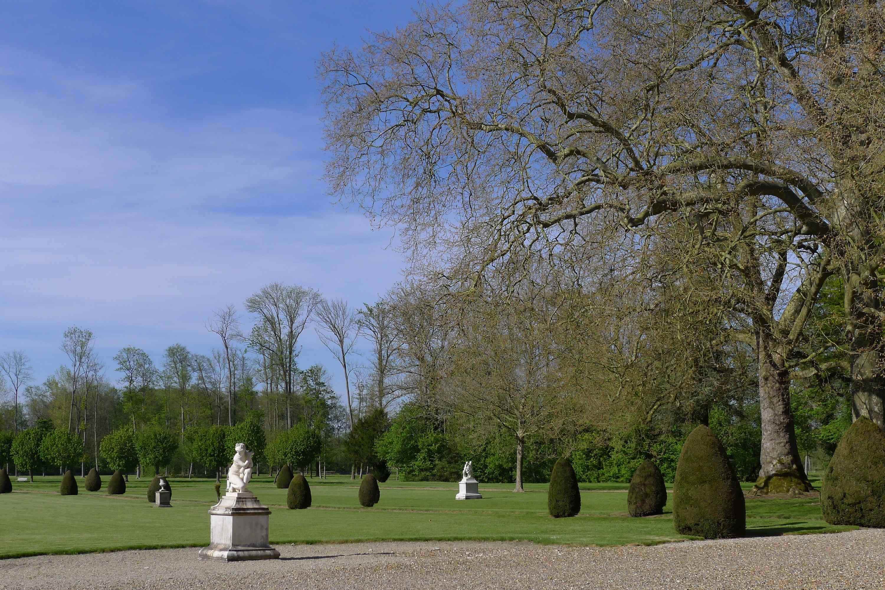 Вокруг замка-музея регулярный парк, с подстриженными деревьями, скульптурами и прудами. В прудах сначала плавали гуси и утки, но их разогнал злобный лебедь и плавал потом в одиночестве. Вода в пруду прозрачная, но темная, как в наших лесных прудах – наверное, торфяная почва.
