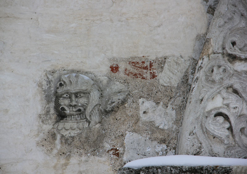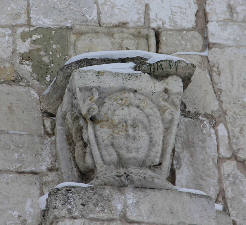 Мне очень нравится белокаменная резьба на Георгиевском соборе в Юрьев-Польском. А сейчас, зимой, она припорошена снежком, поэтому Слоник стоит в сугробе.