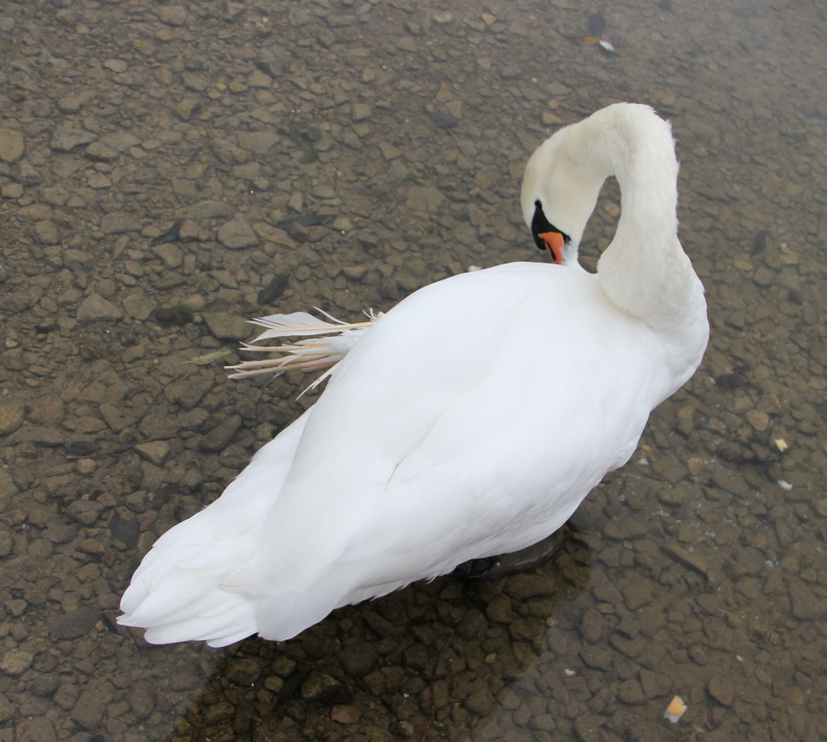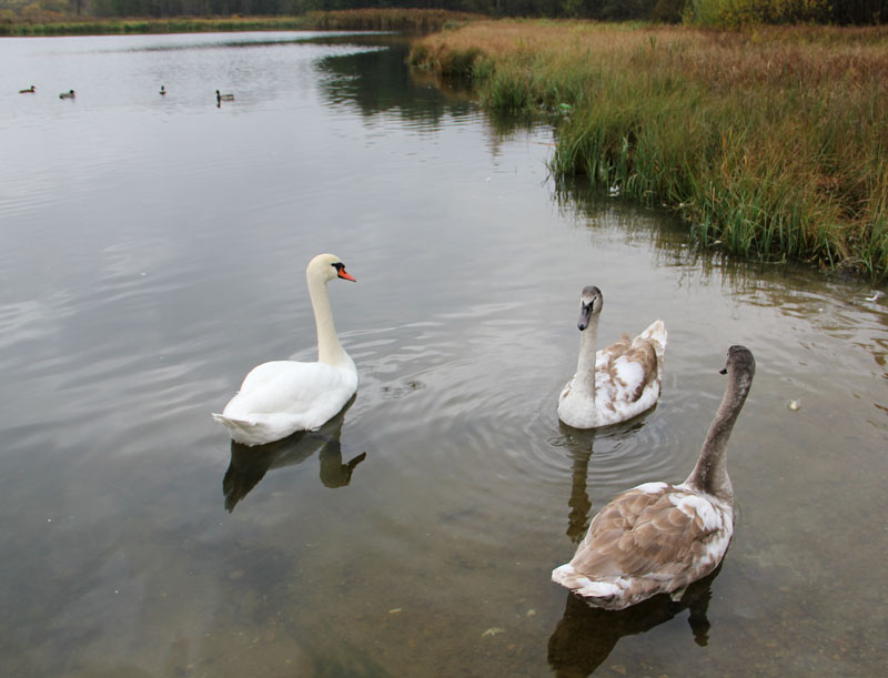 Там много лет живёт пара белых лебедей. Они выводят птенцов и до следующего выводка воспитывают. В этот раз у них было два сереньких птенца и один белый с раненым крылышком из прошлого выводка.