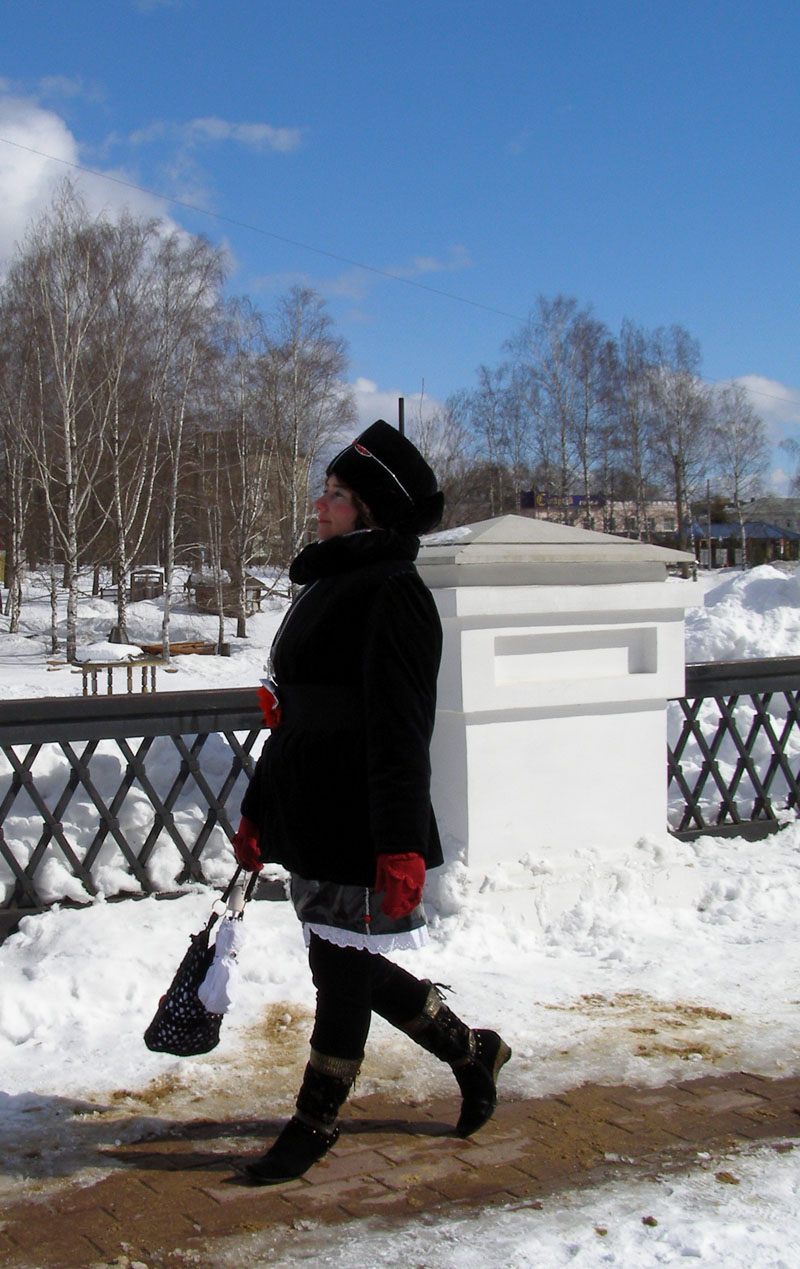 А ещё в Угличе есть городская сумасшедшая. И я её видела. :" Она сидела на оградке моста, когда мы проходили к Кремлю. Сфотографировала я её на обратном пути - она прогуливалась. У неё даже белый зонтик есть.