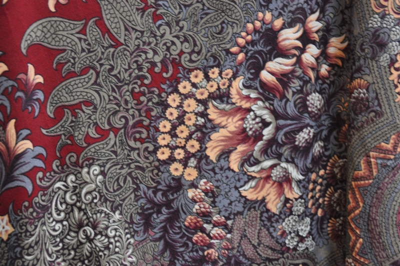 И, наконец, переходим в заветную платочную комнату, из которой нас выгоняли почти пинками, выключив в ней свет. :lol: Но потом пустили нас туда в конце экскурсии ещё раз. Пожалели, что ли ;) Там я впервые увидела шали, которые до этого часто разглядывала, листая альбом Н.В. Толстухиной и Т.А. Полосиновой (Кликните, чтобы почитать оффтопик).... Одна из них - Хохлома Златы Ольшевской. Хочу сказать, что некоторые шали в реале оказались значительно бледнее, если можно так сказать о цвете - глуше, чем на иллюстрациях в альбоме, но не эта!!!