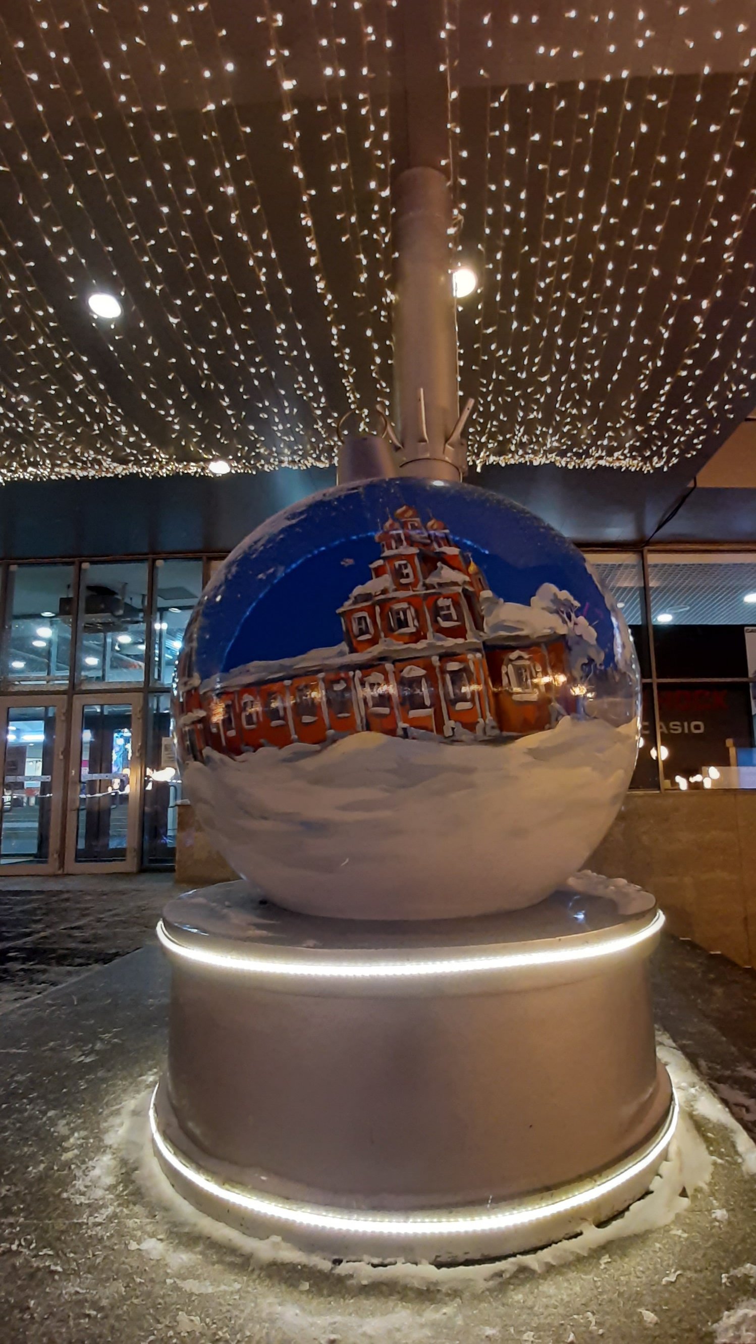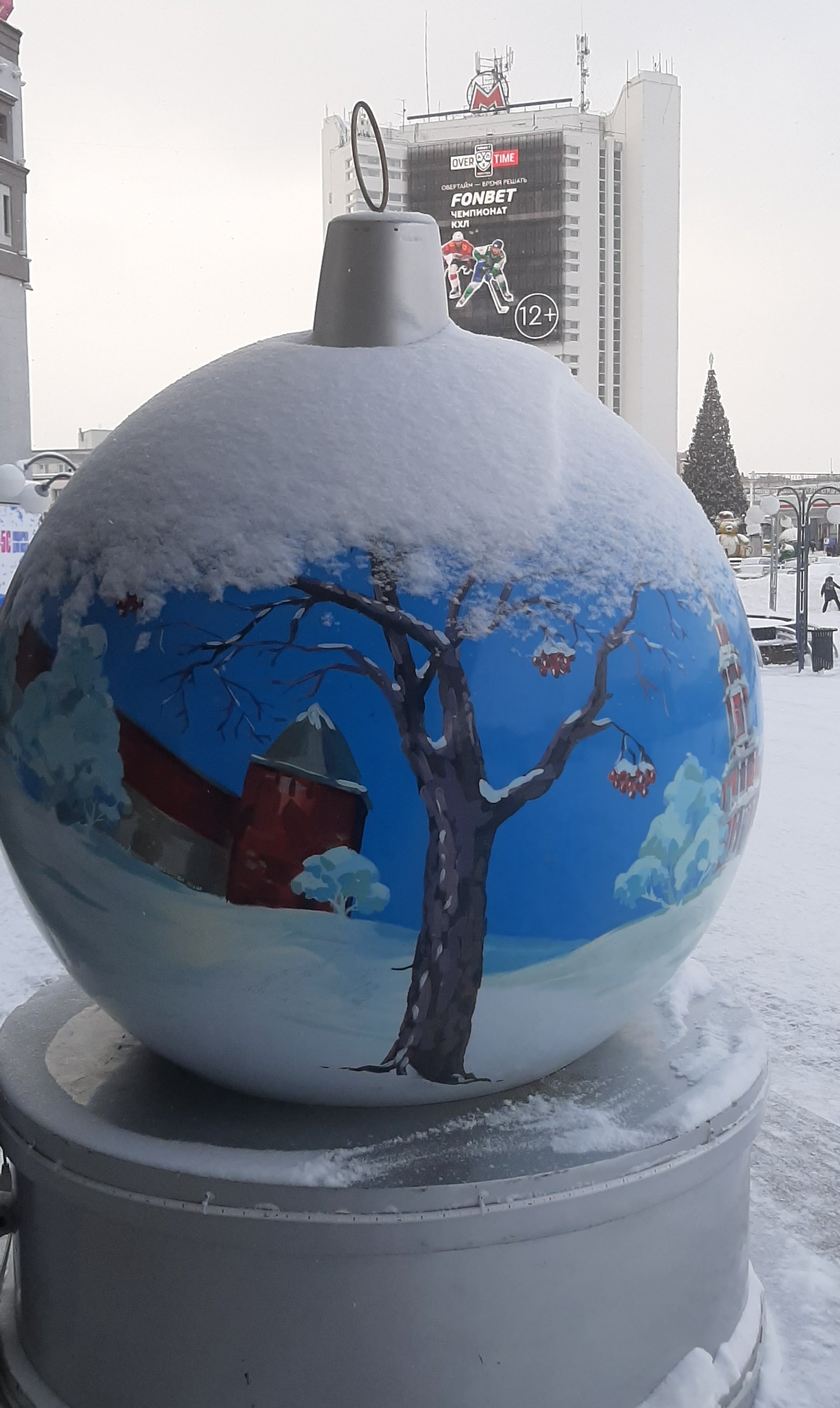 Еще интересно украсили вход в ТЦ "Республика". Посетителей ТЦ встречают припорошенные настоящим снегом гигантские елочные шары с видами Нижнего Новгорода.