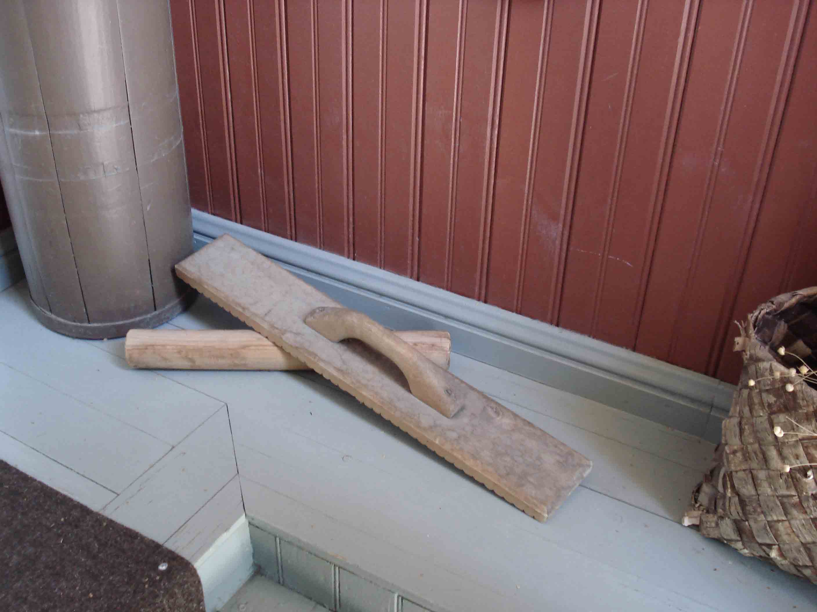 А этот предмет не всякий узнает! Это...утюг! На круглую гладкую полешку вещь аккуратно наматывалась и плоской деревяшкой с ручкой многократно "прокатывалась"-проглаживалась. Мне в детстве посчастливилось такое увидеть, даже попробовать попользоваться, поэтому мне и угадывать не пришлось... Кстати, нижняя часть у штуковины с ручкой ребристая, она и помогает "разбить"- разгладить заломы на ткани.