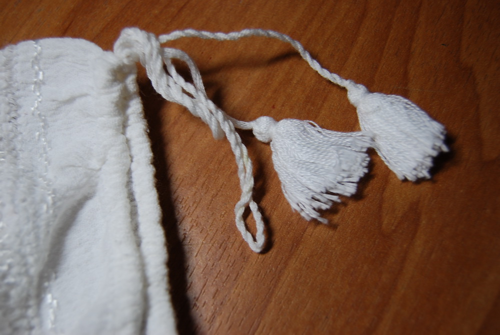 Люба, на мой ,непрофессиональный взгляд, шнурок скручен вручную из сложенных в несколько прядей нитей. А кисточка на конце самая обычная, из простых белых ниток. Не крученых. В рукаве продернут такой же шнурок. Выход из кулиски (это отверстие в которое входит и выходит шнурок с кисточкой?) на плече, как на фото.