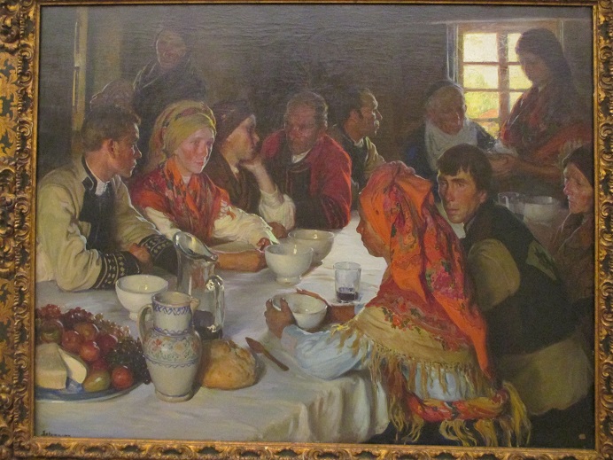 Краткое описание картины (перевод с испанского и английского) : "Любимой темой полотен Ф.А. де Сотомойора были привычки, обычаи и бытовые сцены жизни испанской Галисии начала 20 века...На полотне - свадебное застолье. Жених, невеста, их родственники, старый пастор в торжественной, нарядной, соответствующей событию одежде...."