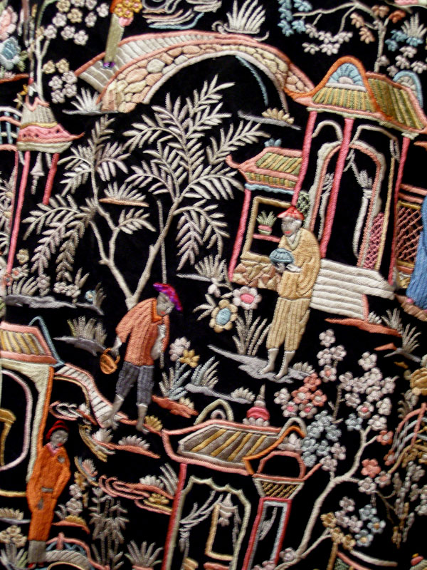 А вышивка на кантонских шалях, которые изготавливались в Китае в конце XIX века в городе Гуанджоу (Кантон), и которые можно было носить с двух сторон, была двусторонняя.