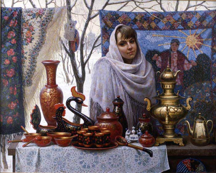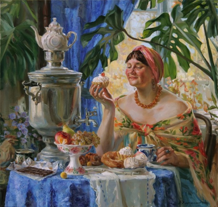 Картин,посвященных чаепитию и платкам,к сожалению,у меня мало.Может,кто-нибудь продолжит тему?