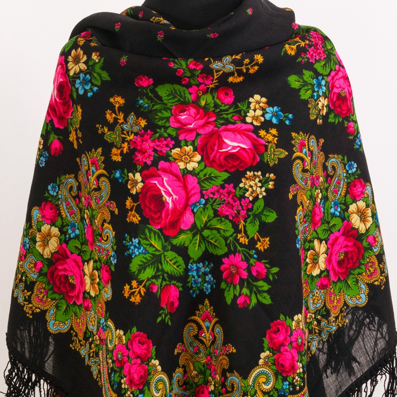 Классическая павлопосадская шерстяная шаль с насыщенным цветочным орнаментом в теплых золотистых, черных и красно-розовых тонах. Автор рисунка известный павлопосадский художник Зиновьева Клара. Богатство и разнообразие цветочной группы очень эффектно выглядит при детализованном рассмотрении платка,. Контраст насыщенного и богатого рисунка подчеркивается глубиной черного цвета фоновой основы платка. Платок обрамлен черными шерстяными кистями монохромными под цвет каймы.