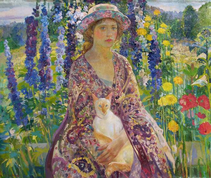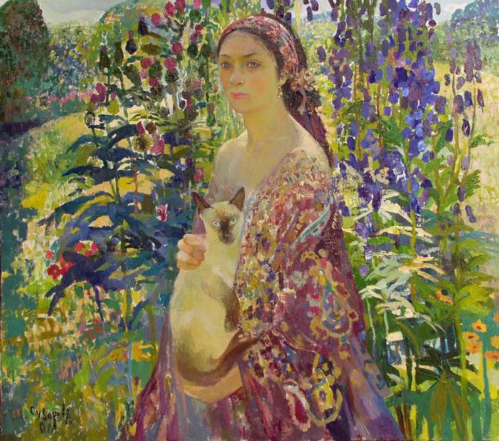 На портрете А.В. Баталова, изобразившего поэтессу в зрелые годы (1952г.), шаль пестрая, она скорее похожа на шелковый платок.