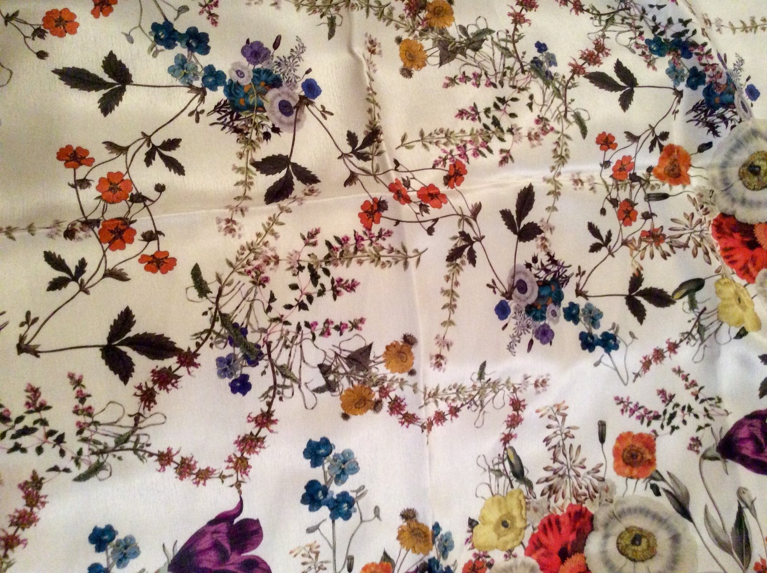 Я вчера в дисконте купила шёлковый платочек с луговыми цветами, думала- это тот, который Оксана показывала- Ботанику 10142. А потом рассмотрела, что это другой- 10127 (-17). Был ещё с бирюзовым фоном. Мой- вот такой (солнца больше нет, извините за мутное качество, зато уменьшать размер не пришлось):