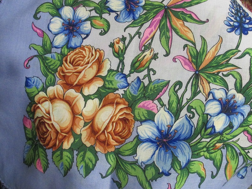 89 на 89 с шёлковой бахромой. "Весеннее путешествие" ( здесь 2 колорита, в некоторых магазинах, говорят, замечены 4 ..). Весёлый, яркий, но ( на мой вкус ) - розы в углах композиции - спорно. Оттенок голубого - очень красив. Зеленовато-оливковый (-10) меняет цвет в зависимости от освещения сильно (!). Наиболее достоверен на "парных фото".