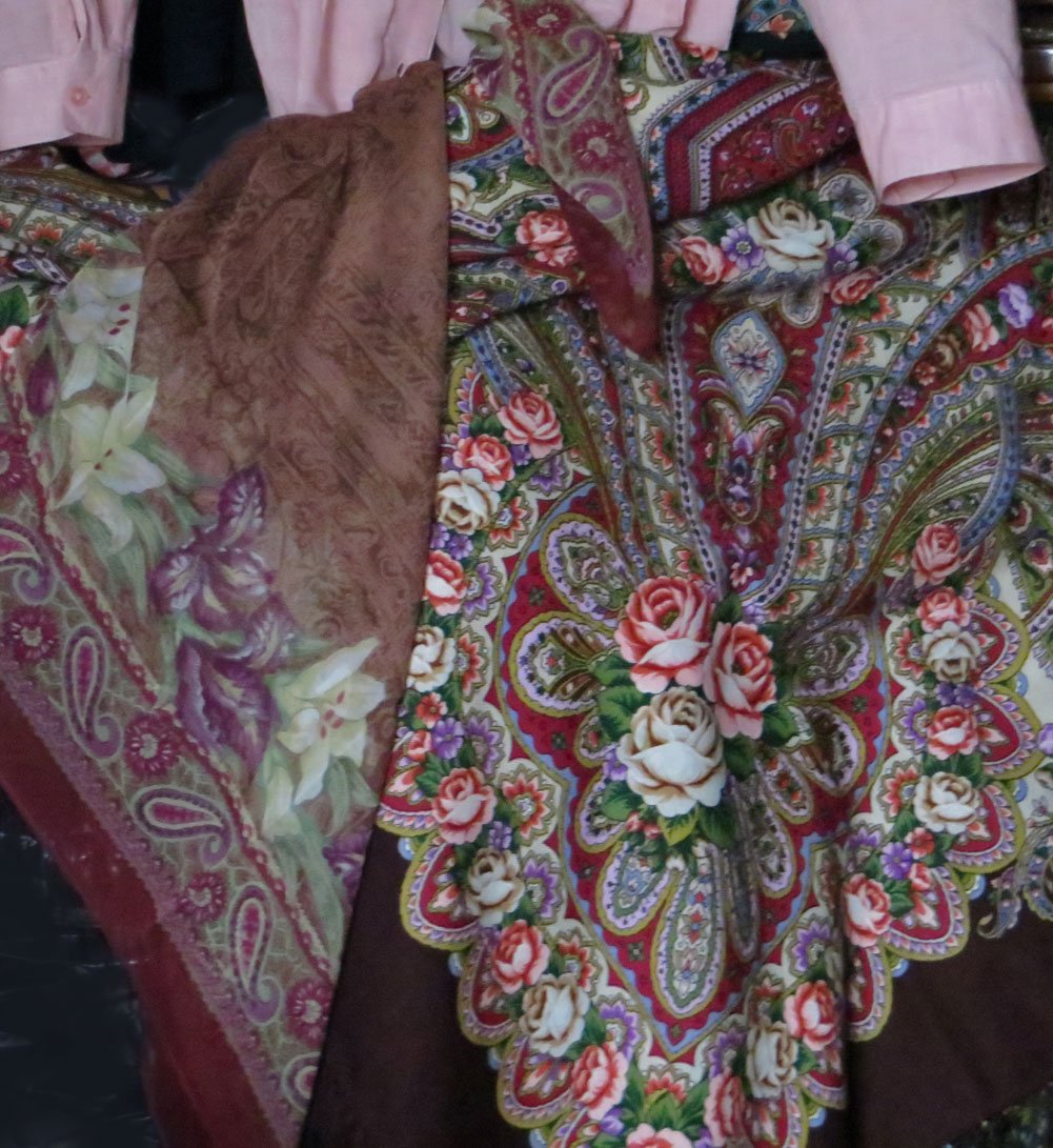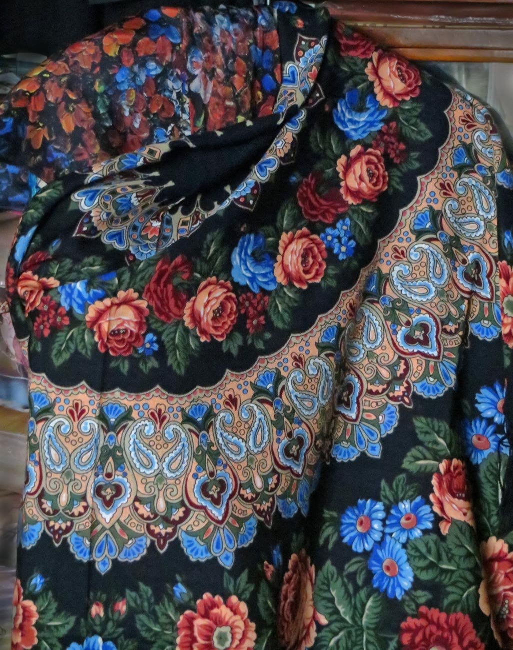 Сразу замечу: к экстравагантности в этом вопросе не стремлюсь. Мне такие ансамбли интересно - посмотреть, но у меня более утилитарный подход. Знаю, что многие отвергают, считая неинтересными, варианты, когда шаль и платок слишком похожи, сливаются, перетекают друг в друга. Мне же это вполне нравится.