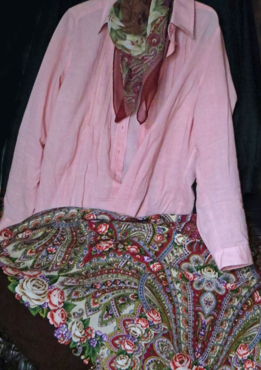 Задача была четкая: подобрать что-то на шею к платку Елены Жуковой 1653-7 На крыльях нежности (135х135, шерсть), розовой рубашке из тонкого хлопка и зеленым порткам.