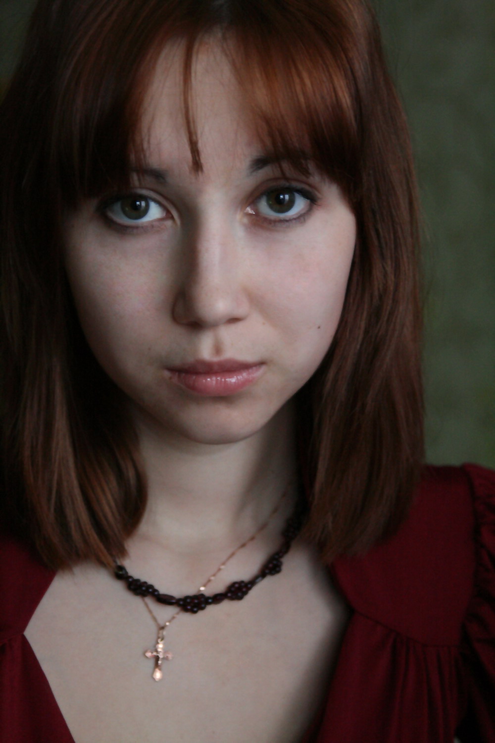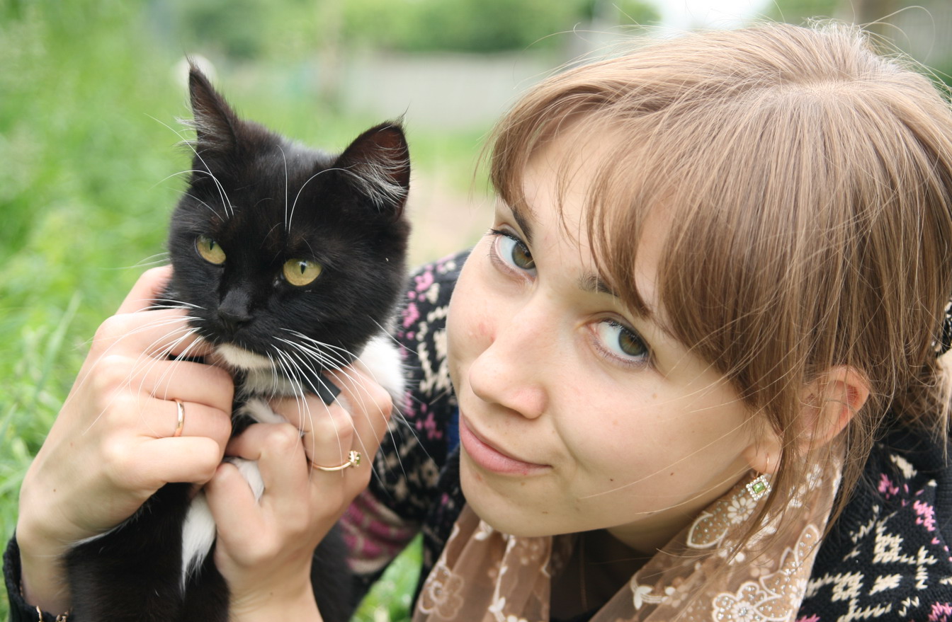 Глаза зеленые. даю фотку со вспышкой, где виден их цвет (волосы на ней крашенные, рыжие)