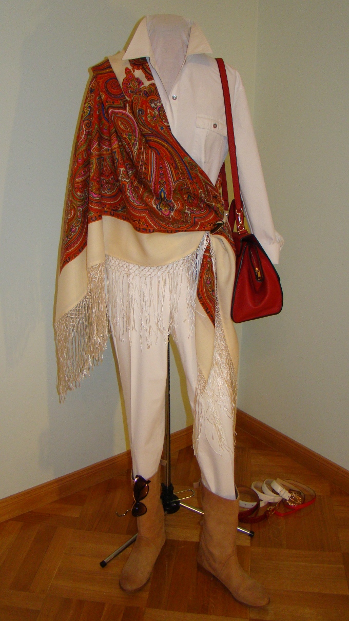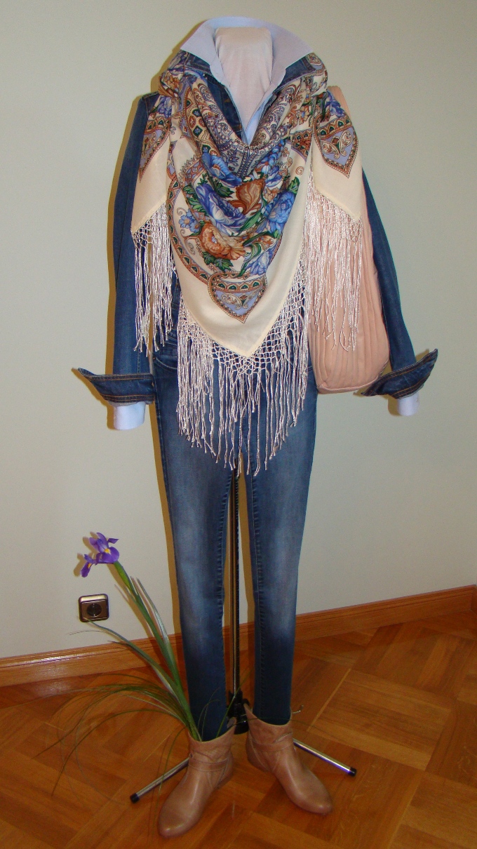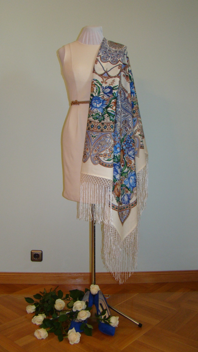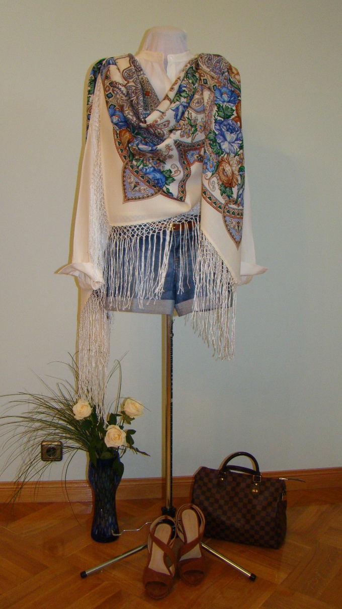 Нежданный белопольный Княжеский вызвал неожиданную реакцию – кому-то показался недокрашенным, кому-то – слишком простым, а меня неожиданно очаровал. При безумной любви к разноцветным шалям, очень не хватало чего-то более спокойного, почти монохромного, сдержанно-нежного. А при личной встрече оказался он достаточно ярким, но очень изящным, изысканным, но чуточку капризным … «трепетным» назвала его моя приятельница. Сразу представился в элегантном комплекте с классическими костюмами из шерсти, васильковой или «цвета слоновой кости» ; с велюровым белым пальто и непременно синими перчатками (как у Ванессы); или с легким платьем из голубого кружева или шитья, и чтобы юбка «летящая»; или со светлым платьем в пол в «ампирном» стиле; а ещё с бесподобными вязаными юбками и платьями ( как у Брусники и других наших рукодельниц)…