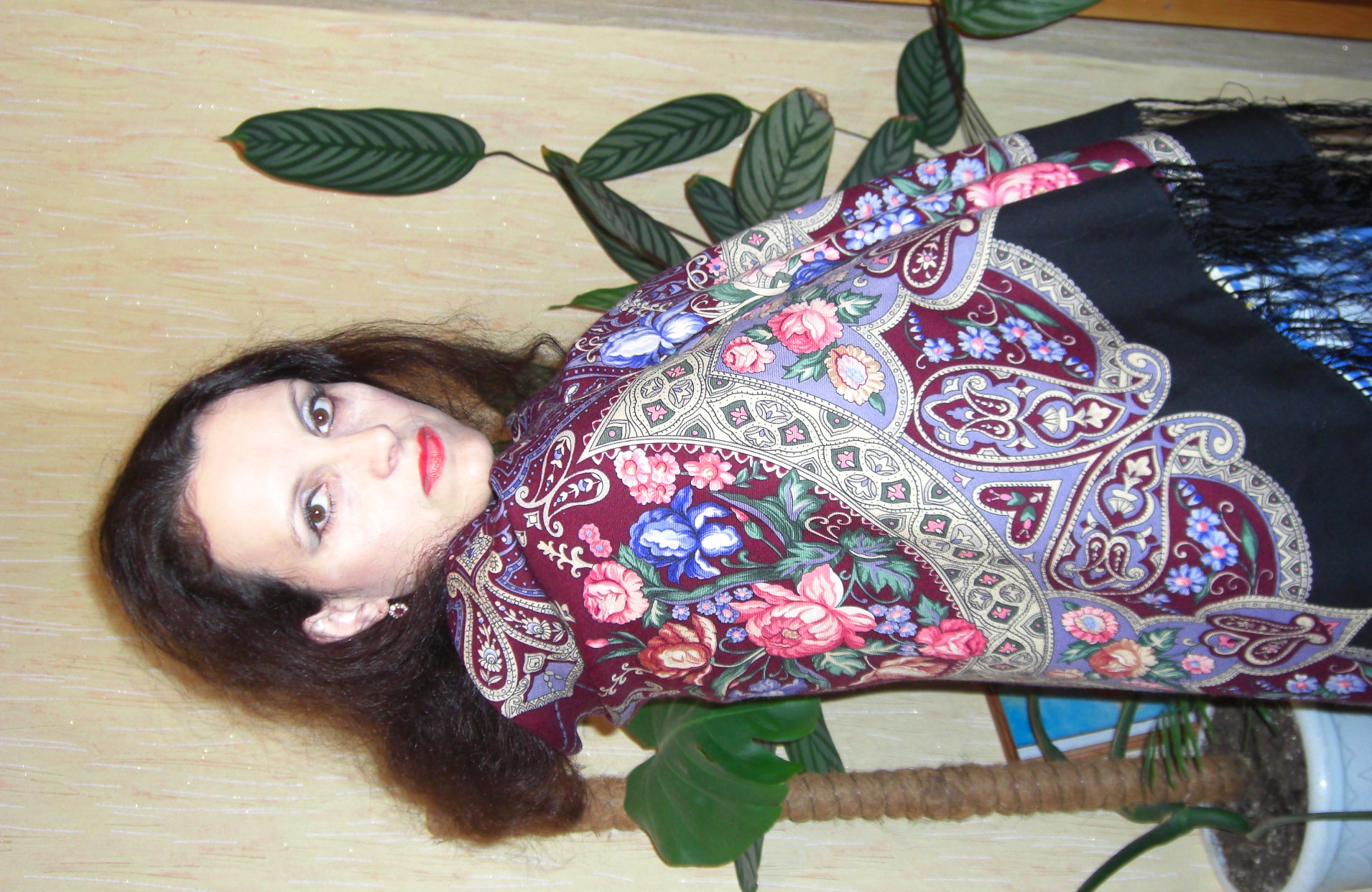 Наталья вам нужно повернуть второй снимок и поместить его снова. Оба платка на вас хороши, но второй труднее оценить, поэтому первый снимок привлекает больше внимания.