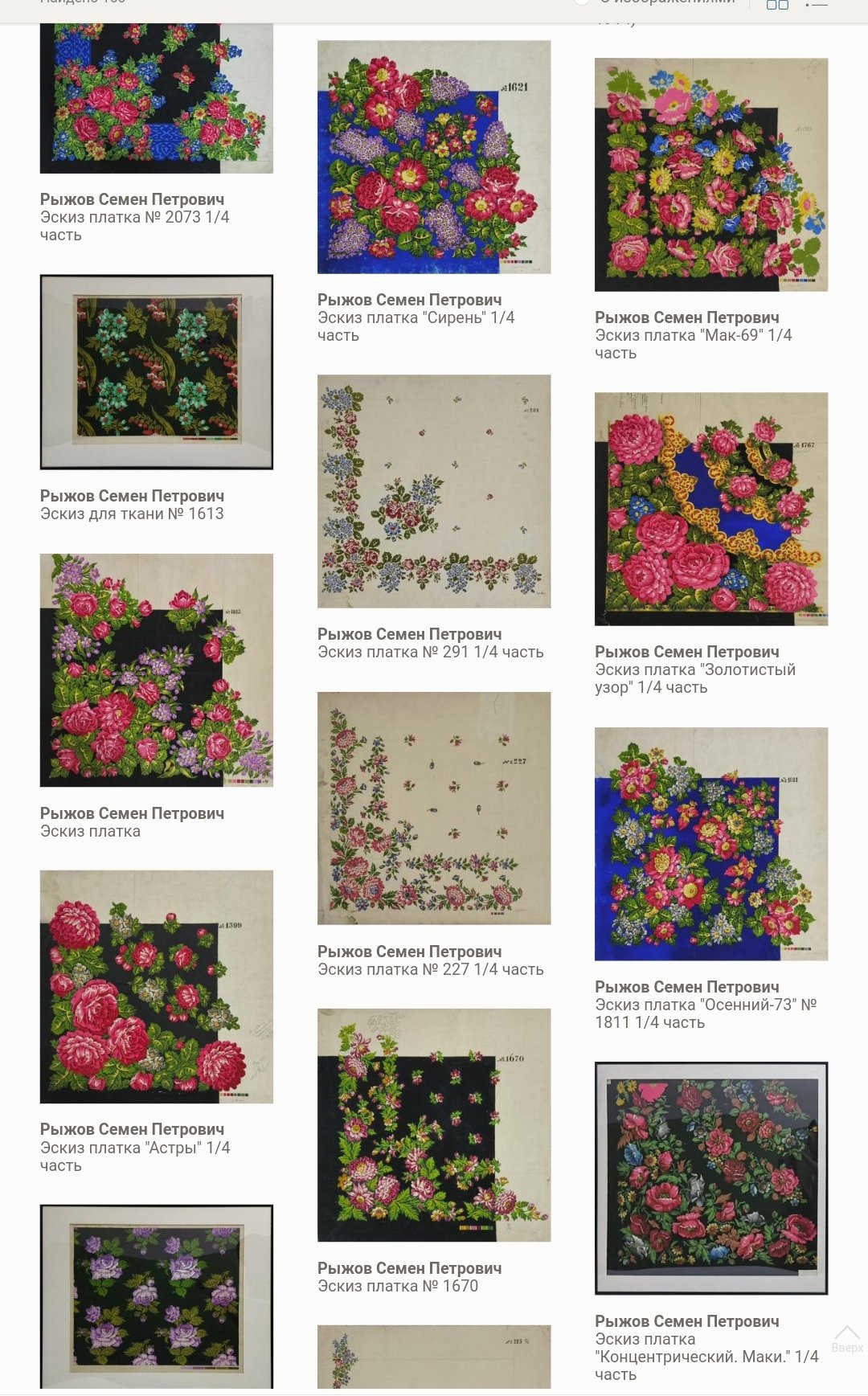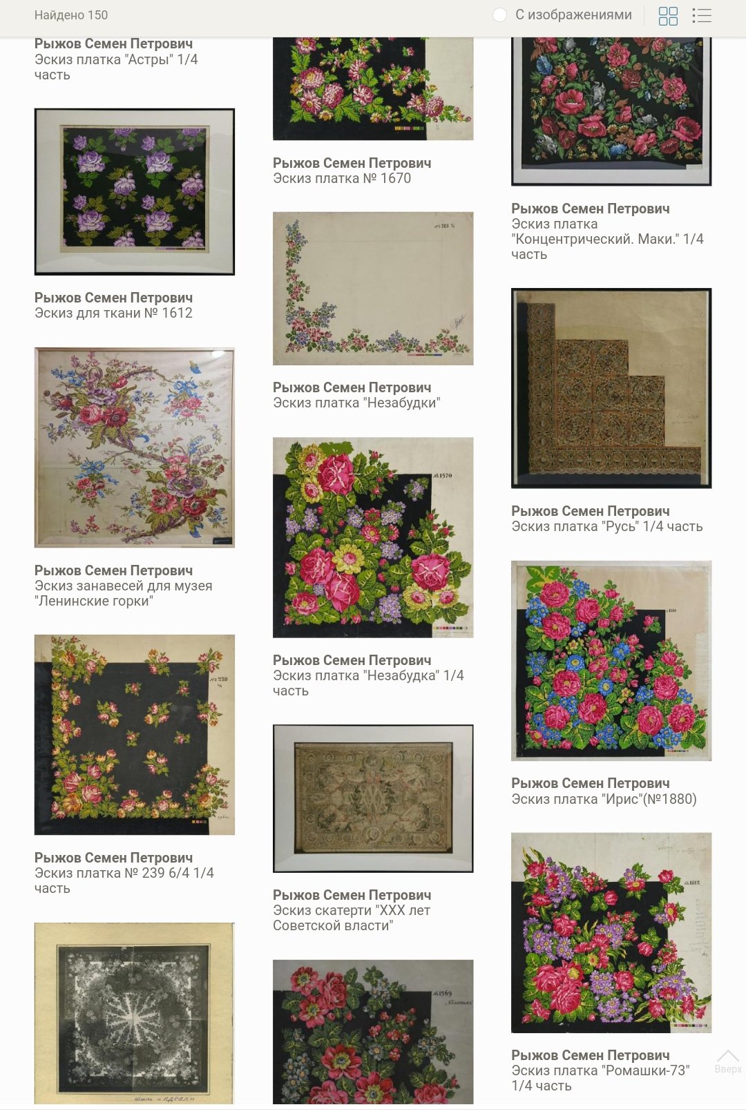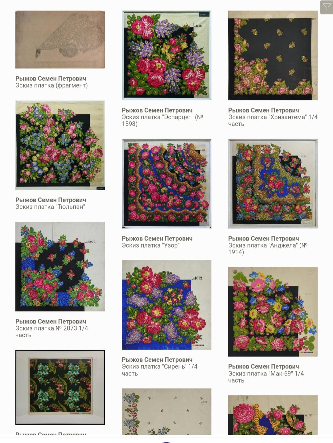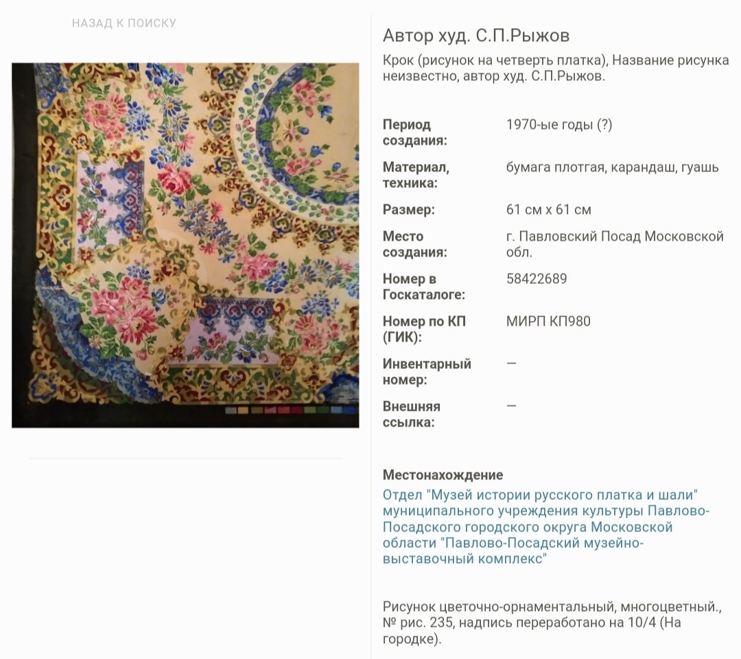 Думаю, платочное производство имеет свои особенности, оно производит демократический в своей сути товар - народный утилитарный платок. Неслучайно, коллекционирование шалей сильно отстает от коллекционирования фарфора по многим параметрам (количество коллекций, изданные каталоги, музеефикация и т.п.). До сих пор музеи в своей массе относятся к платкам в своей коллекции как к предметам костюма, образцам сословного быта, предметам личных вещей того или иного деятеля и т.п. Поэтому так разрозненны платки в музейных коллекциях, плохо описаны в Госкаталоге, плохо сфотографированы.Только недавно стали выходить научные исследования с подходами к анализу рисунка и т.п. То есть за набивными платками признали