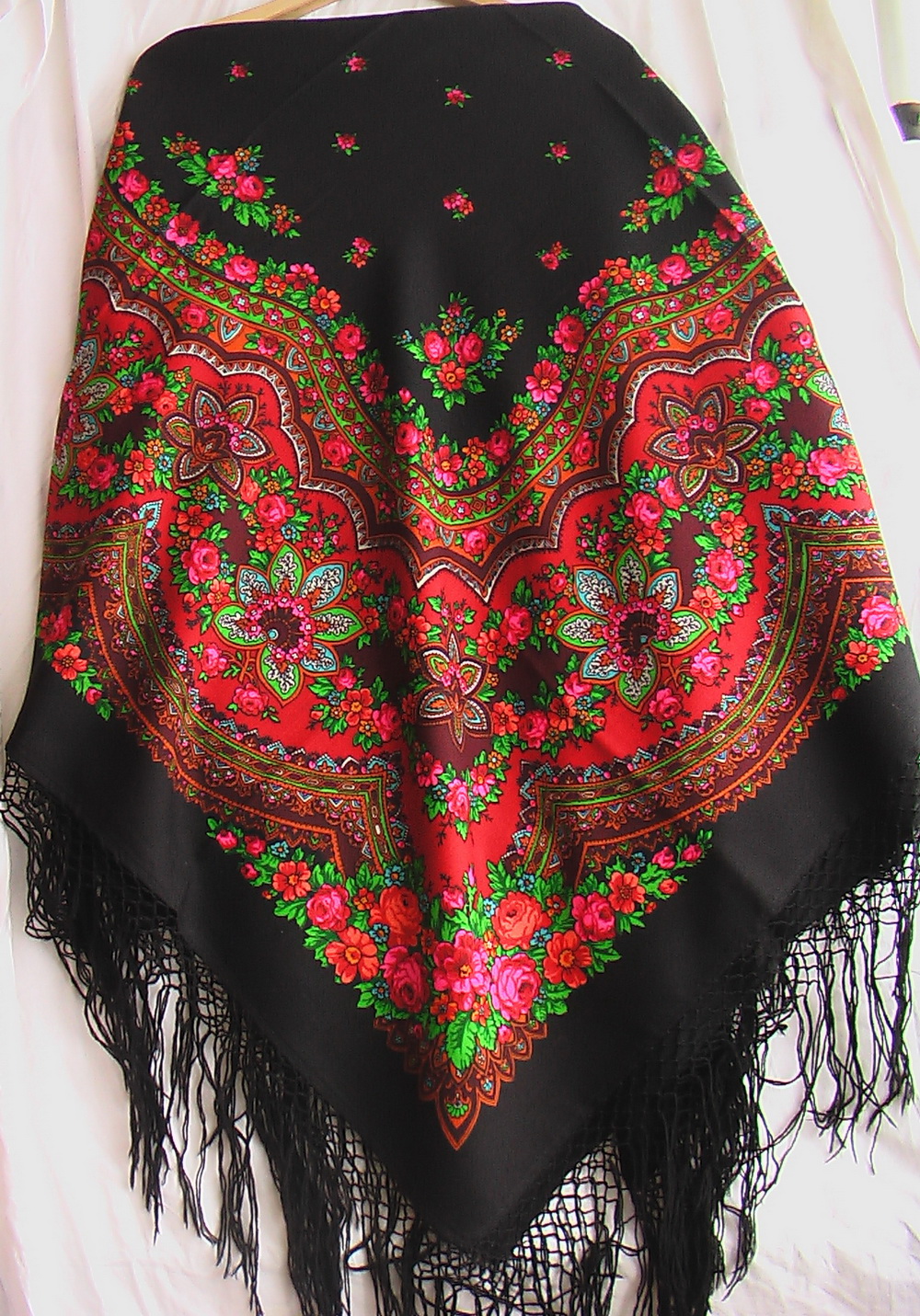 Например постоянно в ассортименте платок "Русская красавица" в двух колоритах: чернопольная с розовыми и чернопольная с бирюзовыми розами. И + один колорит, который каждый год меняется. В этом году в моде цвет "кэмел" - платок в этой цветовой гамме. В следующем году уже модный другой цвет - в этой гамме и новый колорит.