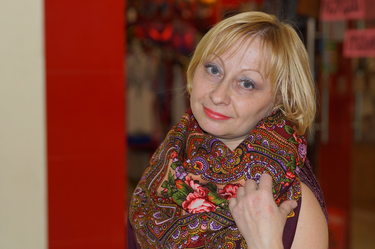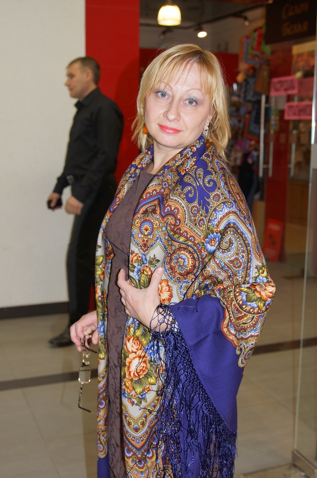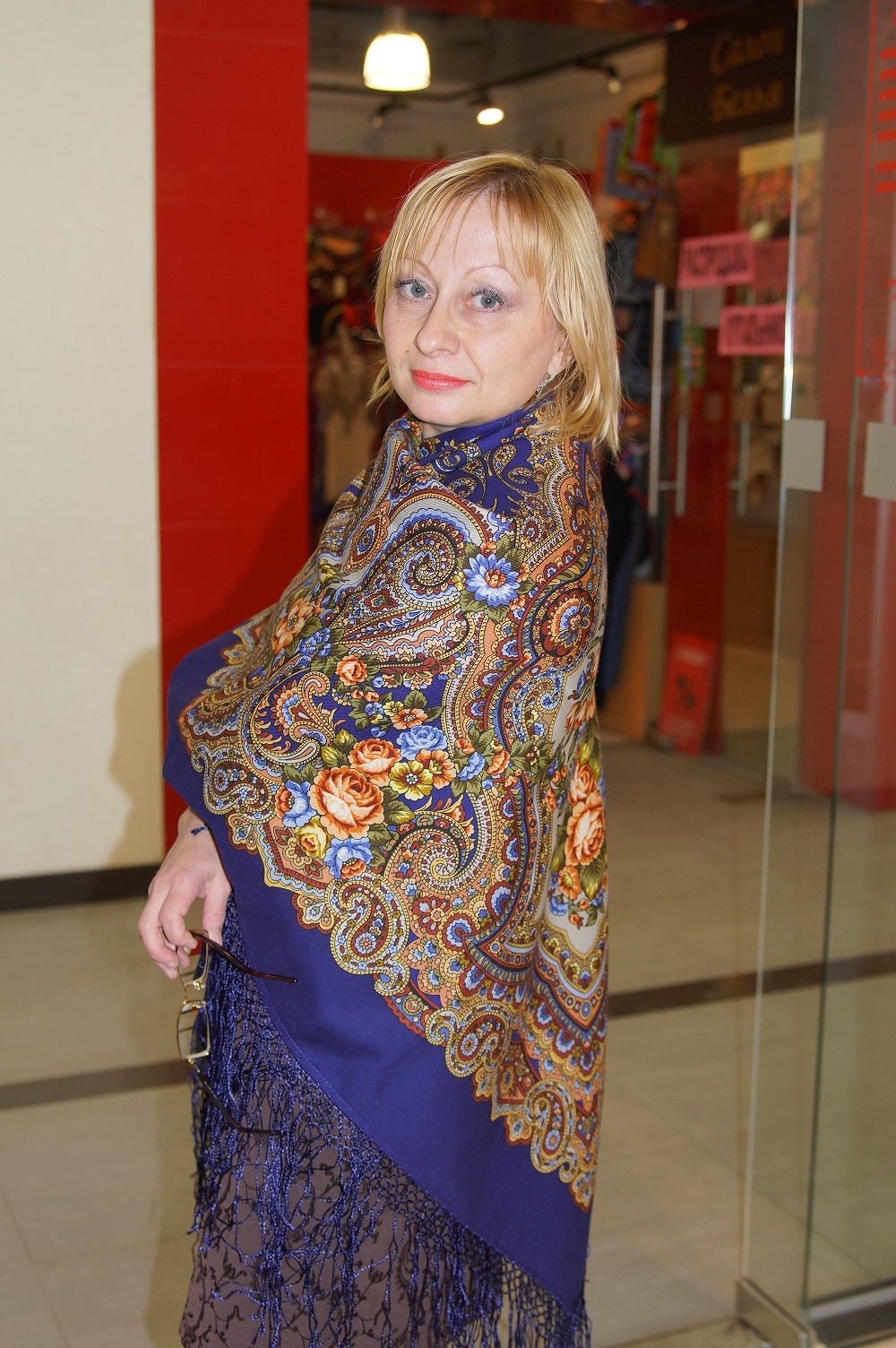 В общем после долгих рассуждений и выслушивания мнений всех прохожих покупателей (у всех разные мнения) решили выбрать тот платок, который походит больше всех по внутреннему содержанию и энергетике для меня. Синий, очень красивый и бохатый, очень хорош на брюнетках и шатенках, но для меня чуток жестковат, строг и высокомерен.