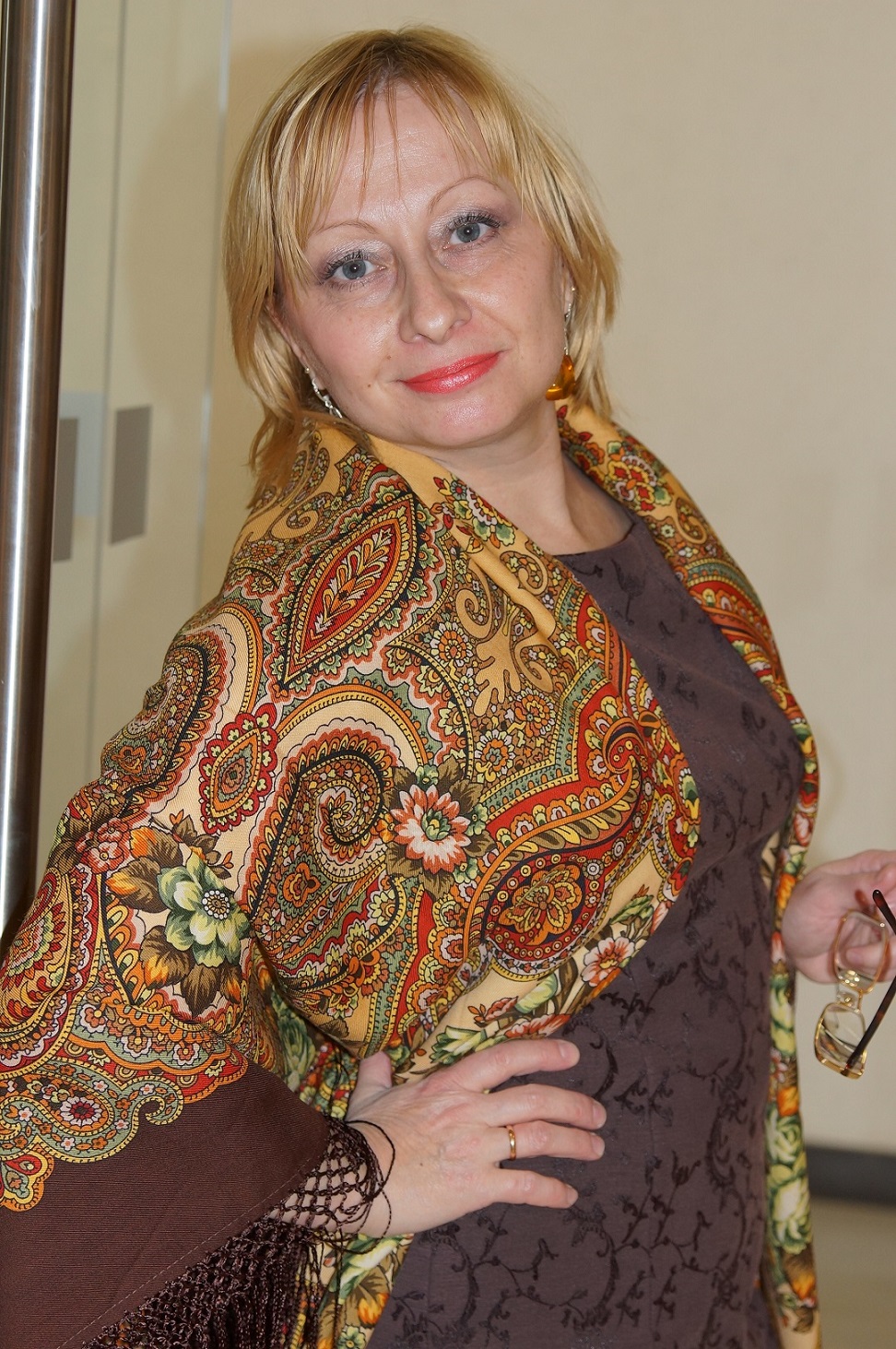 А вот неожиданно (никогда мне особо не нравившаяся Юлия-7) подошла мне своему духу, очень женственно, нежно с намеком на страстность натуры. На самом деле очень красивый платок. в нем много нюансов и чего я его раньше не рассмотрела (с шубой так лучше всех).