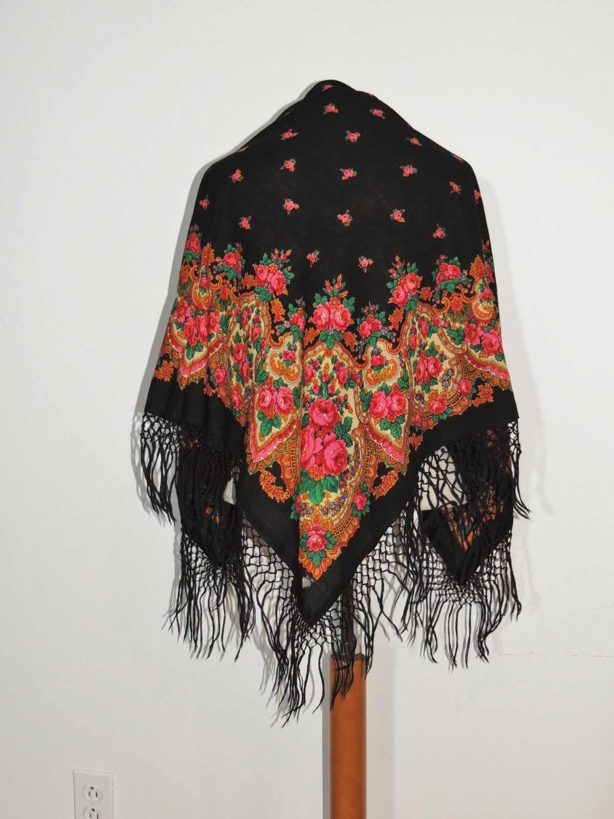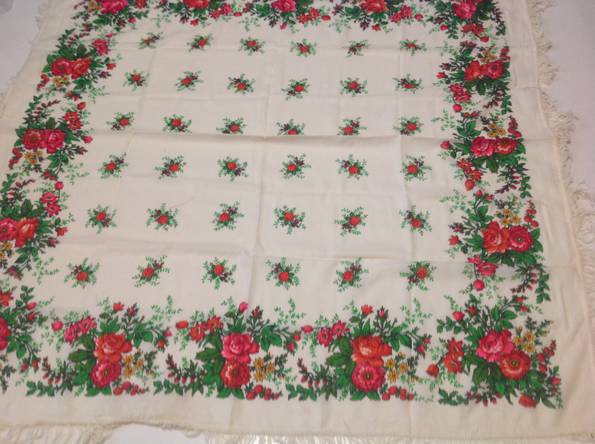 Размер - 1 метр плюс бахрома. Продавец считает, что платок приблизительно 1940х годов, но, может быть, и более ранним или более поздним. Тем не менее, по ее мнению [а она продает старинные шали и платки), платок очень старый.