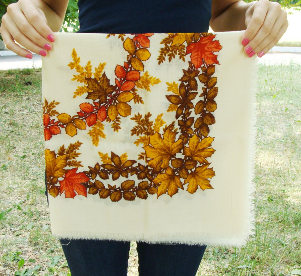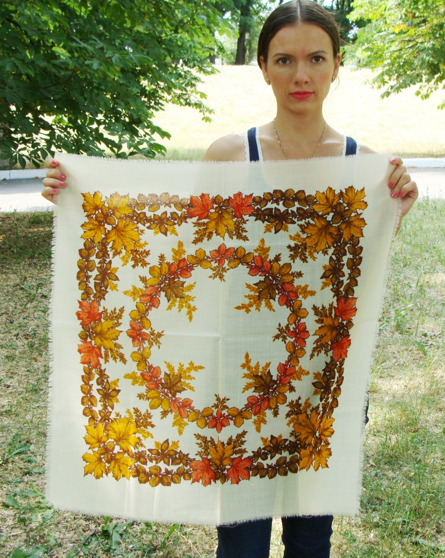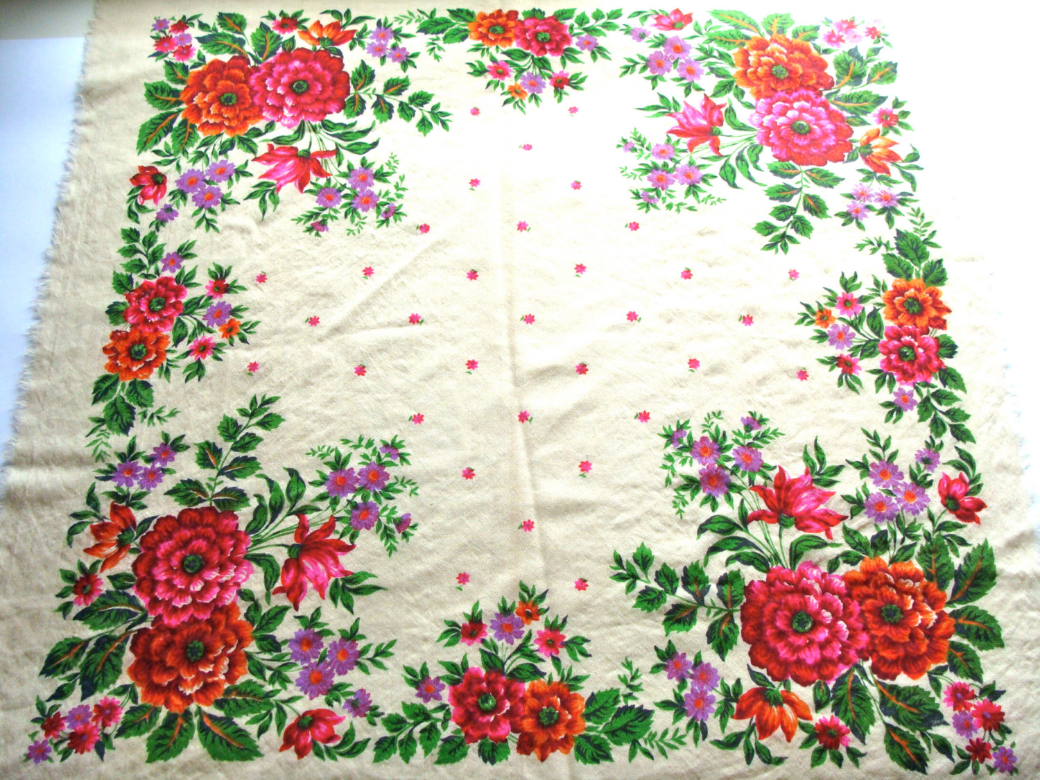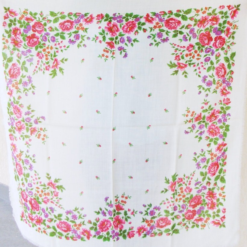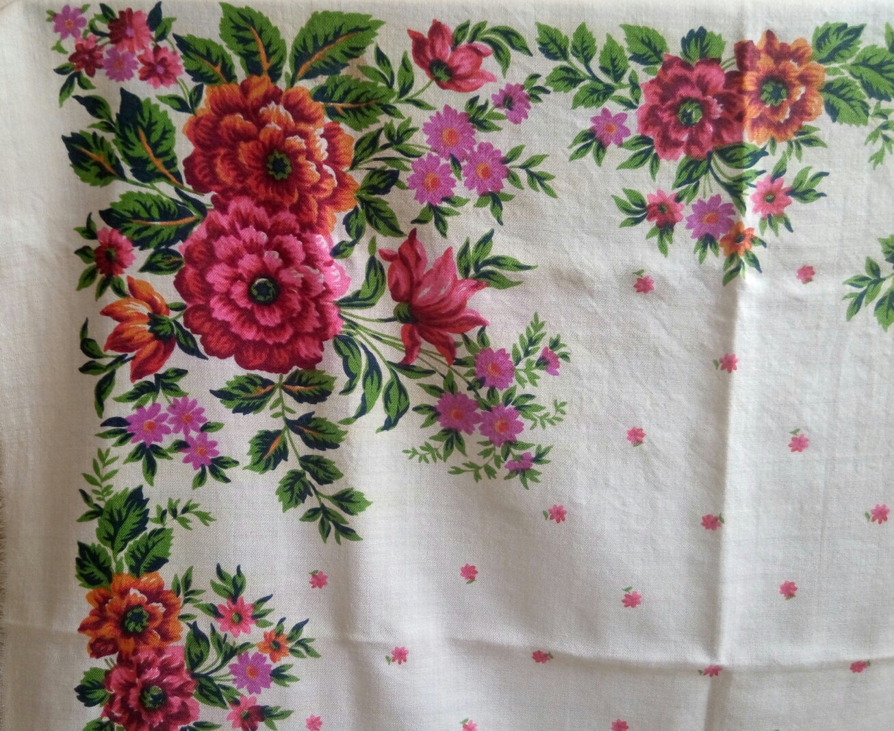 С маками и ландышами. Размер 98х98. Из 1970-х Дорогая eleka! Это павловопосадский платочек - у меня точно такой же!!! Один в один, разве что у Вашего цветочки поярче, но я свой ношу уже лет 20... А где-то год назад увидела в продаже такой же и с этикеткой (надо было купить, наверно?) - сохранила фото этикетки. Вот она:
