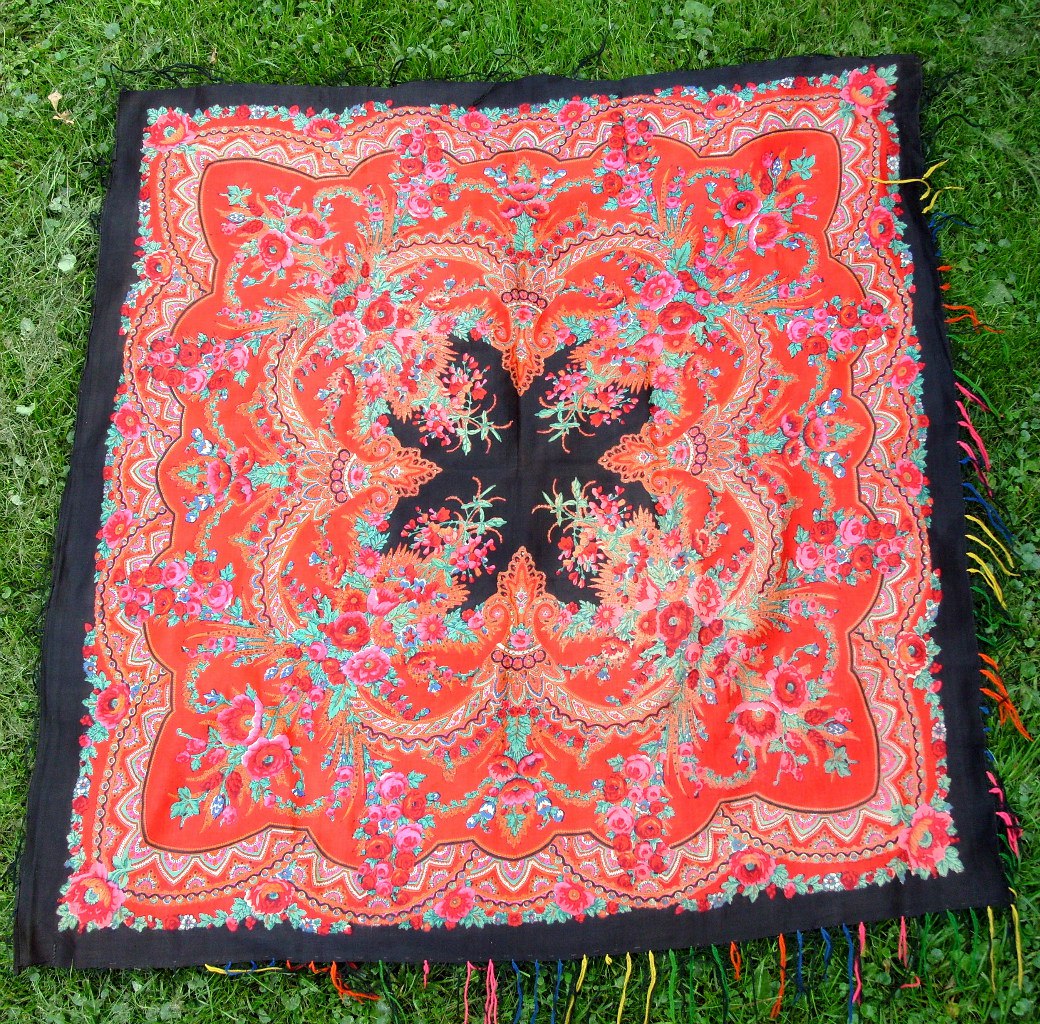 Удивительно, что рисунок красной шали с цветочной каймой, украшенной вписанными в неё угловыми букетами, по форуму уже как-то пролетал на чёрном поле.