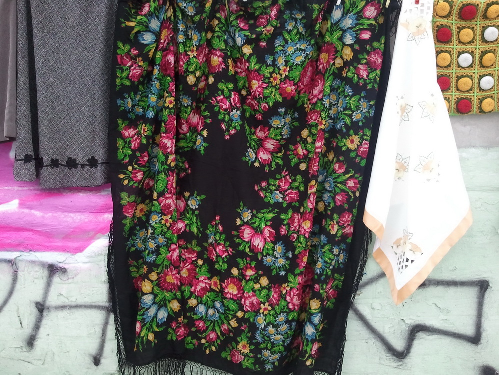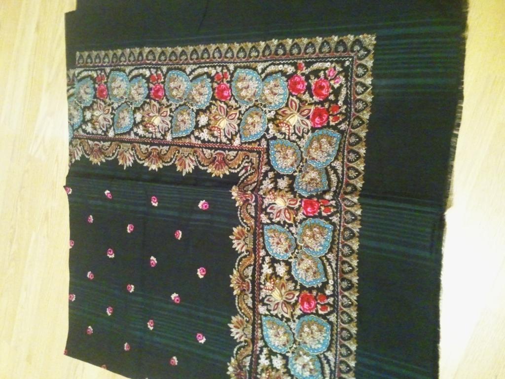 Интересная шаль.. размер 135*138, хорошая уплотненная ткань, но не грубая, а мягкая и шелковистая,длинная шелковая бахрома 33-34 см, в архиве не нашла...