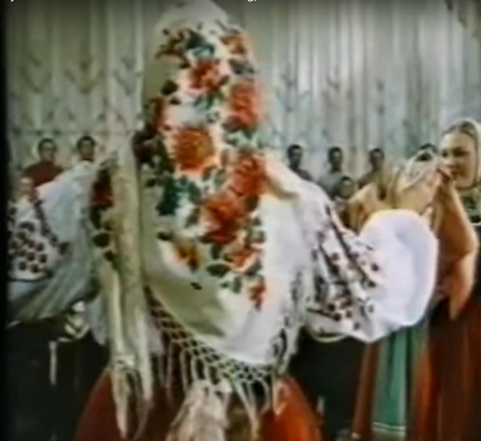tata64 писал(а): Просматривая запись фильма 1953 года, увидела на девушках из танцевальной группы хора им. Пятницкого небольшие головные платки с тем же рисунком. Значит, такой платок выпускался и в уменьшенном размере. Колорит, кстати, тоже немного отличается. (У меня сирень розовая, а здесь - голубая).