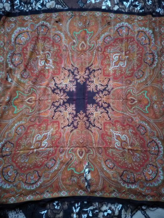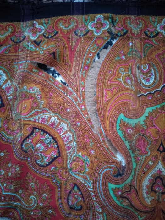Рисунок похож на предыдущий, но в состояние "экспонатов" и набойке видна большая разница Думаю, дело во времени печати и условиях хранения. Эта шаль практически убита...