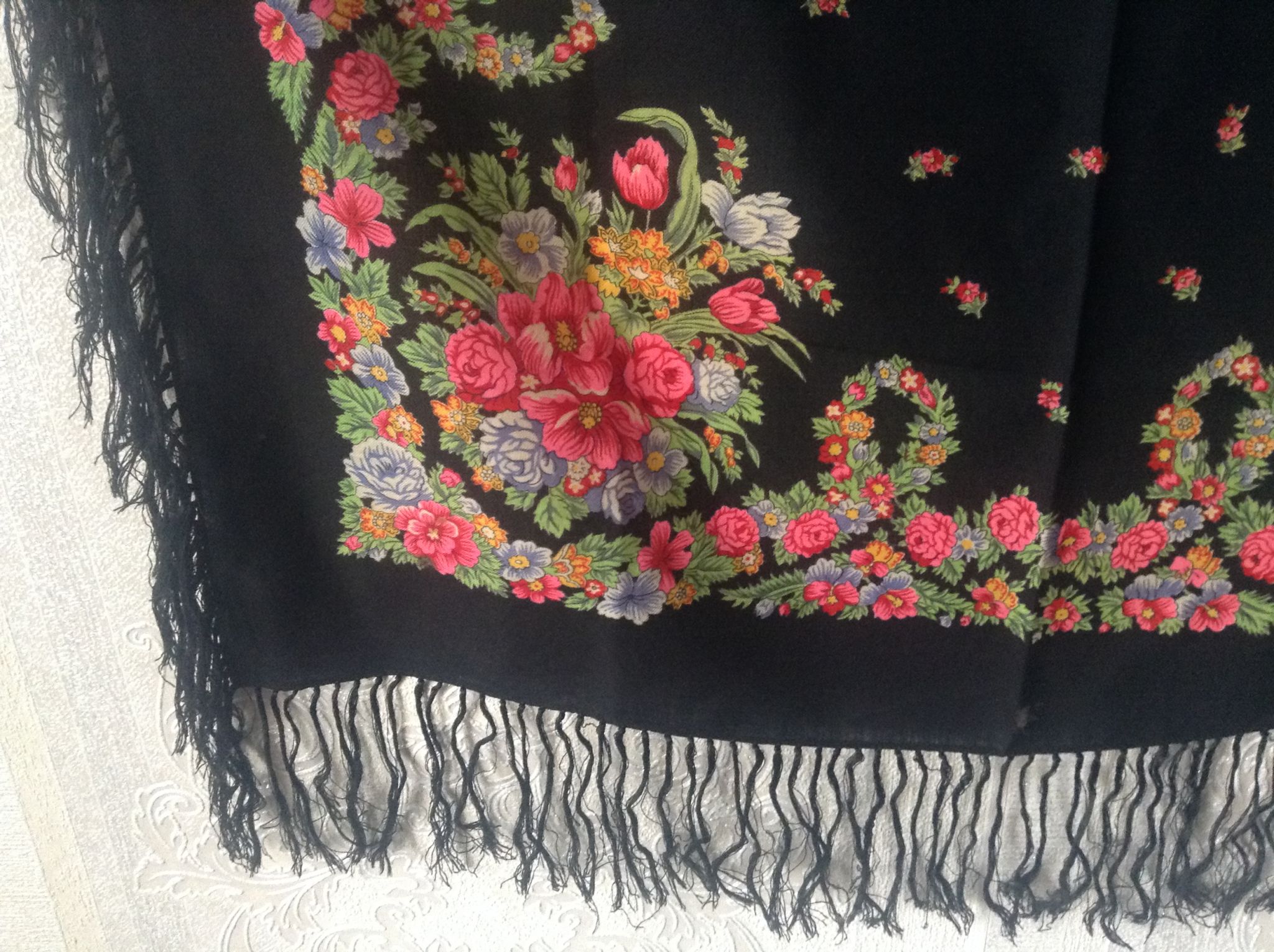 Конечно, платок не из 1950х, продавец просто не в курсе. Автор рисунка - великолепный художник, рука у него точная, цветы живые.