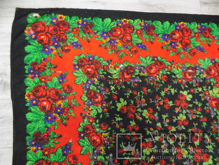 Хоть платок и не в самом лучшем состоянии, но он, имхо, интересен - тем, сколько было разных подходов к "Русскому узору", попыток передать металлическое ожерелье и цветы. Причем, платки эти печаталась в самых разных размерах, в том числе, и в небольших. Не умею стаскивать фотографии, но вот где живет этот платок: https://www.ebay.com/itm/1950s-VINTAGE- ... rk:45:pf:0