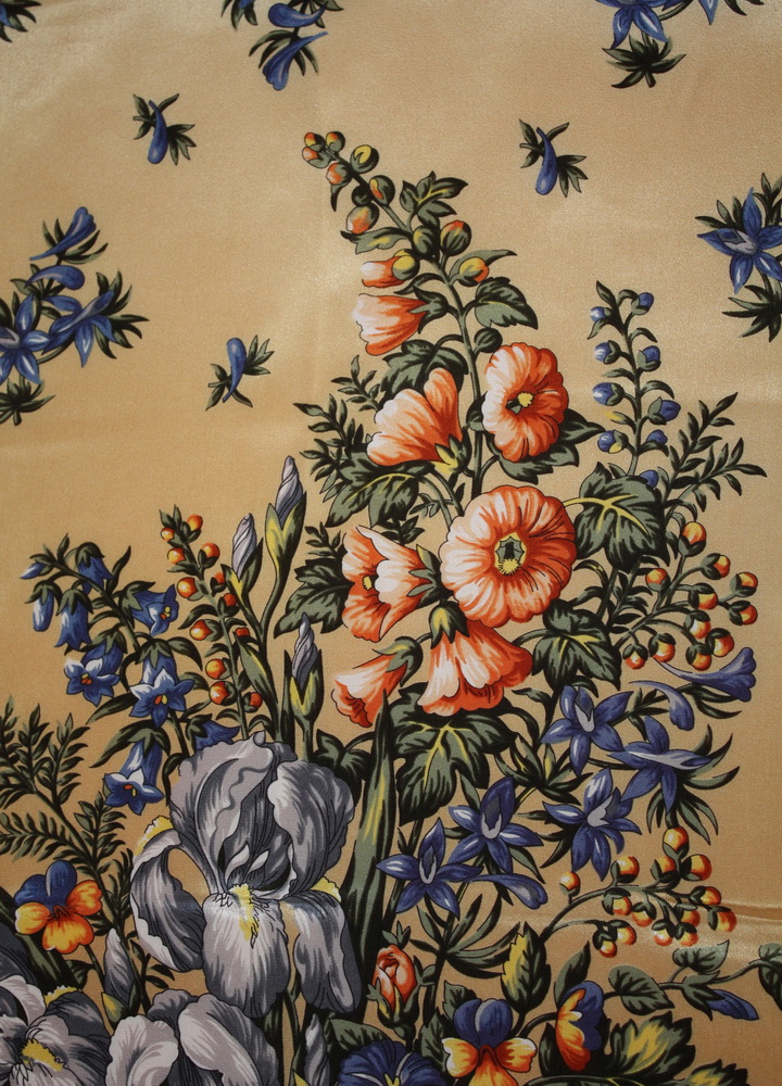 Знаете, у меня тоже был такой платок - Разводной 0. Аляповатый, излишне яркий, без бахромы. Взяла его на дачу, так как было тоже не жалко, куталась сама, а иногда и собак, цеплялись к нему репьи, мок он под дождём. А потом как стукнуло: "Красотища-то какая!"