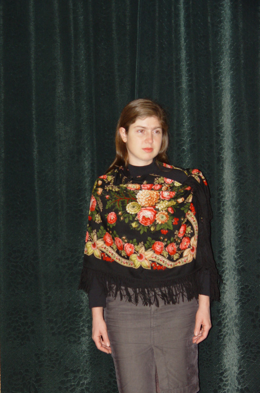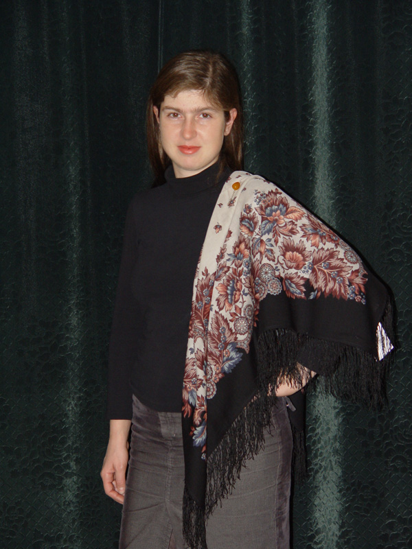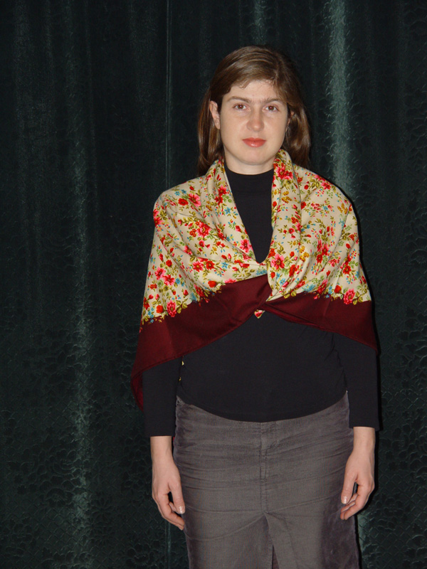 Дочку зовут Анна, восточного в ней ничего нет, но глаза темно-карие, а волосы светлые, может быть это и создает в какие-то моменты такой образ. Оттенки ее не теплые, а холодные, тип - холодное лето, ее цвета: светло-голубой, чисто белый, коралловый, темно-вишневый, сере-светло-зеленый, темно-зеленый, брусничный, красный холодный, фиолетово-лиловый, малиново-сиреневый, серый. Тип и цвета определяла не я, а очень хороший профессионал этого дела. "Цыганка Аза" ей очень идет, но шаль скорее холодная, чем теплая, по крайней мере весь низ холодный, хотя в Павловопосадских платках, я заметила, как правило нет четкого деления на холодную и теплую гамму, разные гаммы присутствуют в одном платке, но я не такой большой специалист по этой части, даже совсем не специалист.Inga писал(а): У Вашей дочери немного восточная внешность,как мне показалось,и теплые оттенки ей очень к лицу.