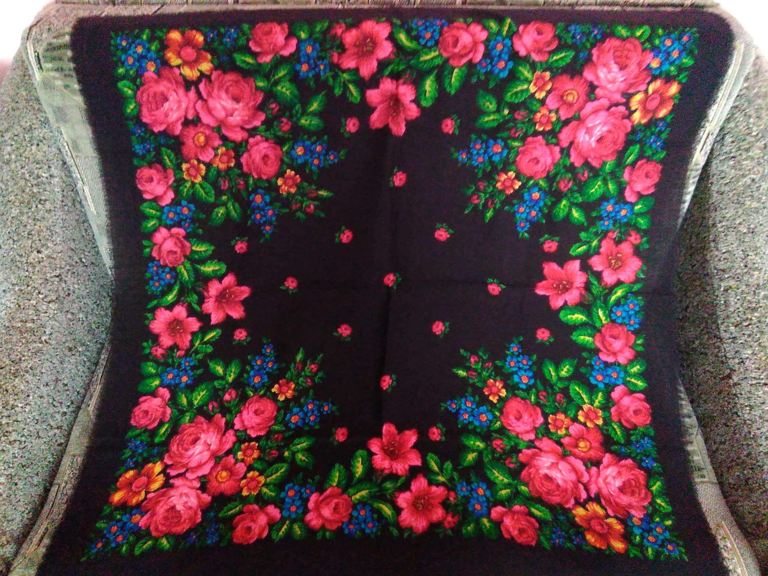 Это сестренка мне фото прислала. Мамины платки советских времен, более 40 лет их помню.Сомневаюсь на счет производителя.