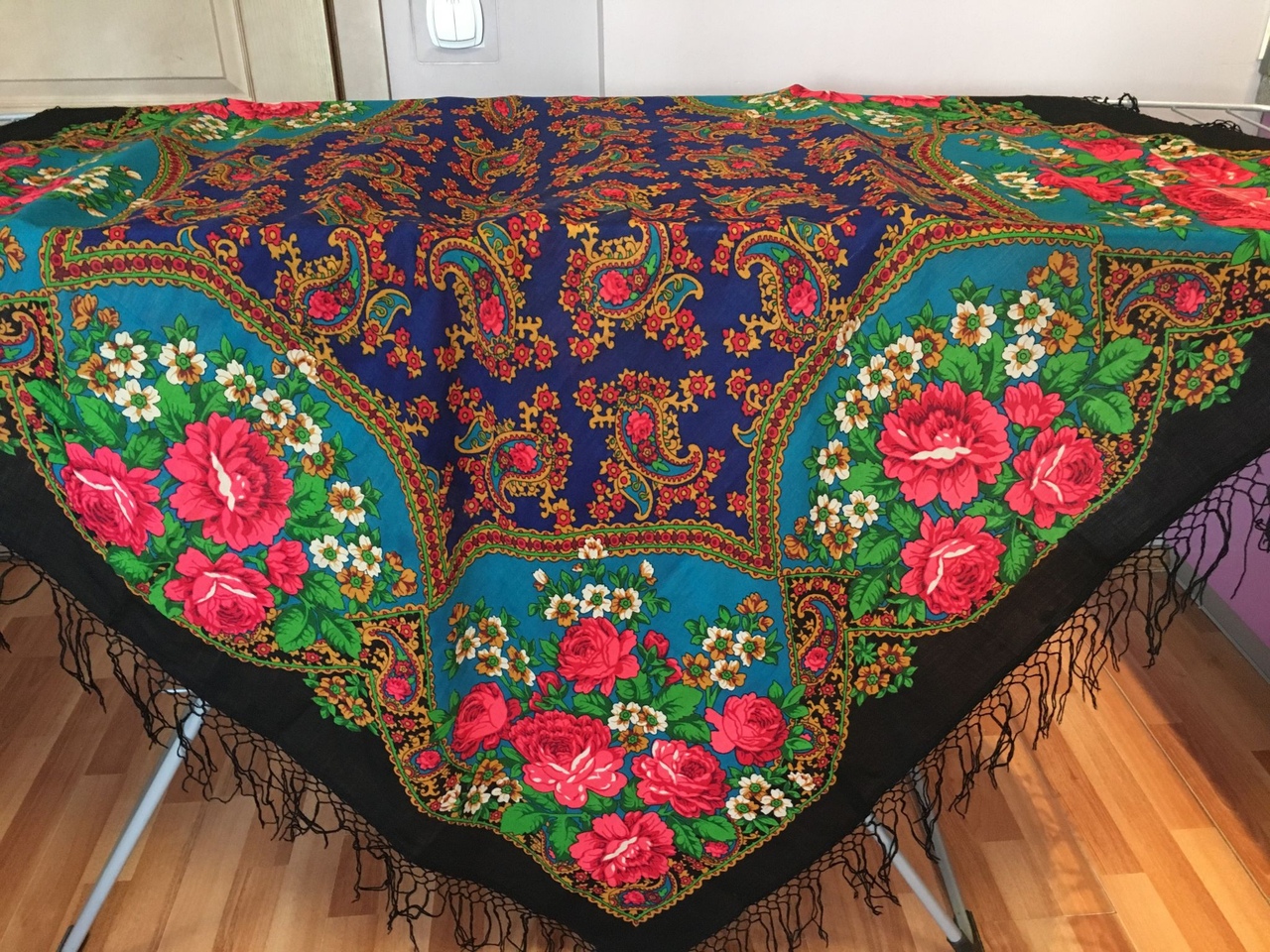 Добрый вечер. Попала ко мне шаль, которая меня озадачила. Большая, с плетеной в 4 ряда бахромой; с осторожностью предполагаю - ручная набойка.Очень знакомые хризантемы, но где я их видела - не могу понять ('Хризантемы' Аболихина похожи, а больше ни у кого не нашла подобного). Такого рисунка в закромах форума не нашла (ходила в БС, смотрела шали с букетами). Помогите опознать.