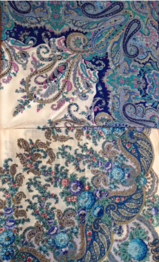 Хоть и Вессений ручеёк 4 и Караван 0 очень схожи, но когда сочетаешь с одеждой, проявляется их раздный характер. Караван более чистый в цветах, в рисунке нет полутонов. А в Ручейке всё таки видны цветы, хоть и синии и бирюзовые, и проскакивает в листиках бирюзова зелёный цвет. И ещё в пользу (у меня) Каравана - его размер. Люблю большие шали.