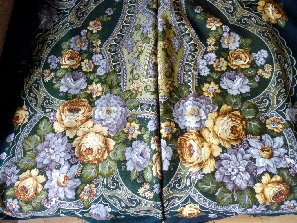 Продолжу про Праздник Покрова-9. Неожиданно для меня оказалось, что последняя печать платка значительно отличается от моего варианта. Во-первых, шерсть - в новой печати она мягкая и тоньше - считаю, что это плюс для ношения в драпировке. Во-вторых, фисташковый цвет в рисунке в старом варианте желтее, желтые розы - насыщеннее и, тем самым, платок смотрится в общем контрастнее. И отличается кайма - в новом выпуске она зеленее.